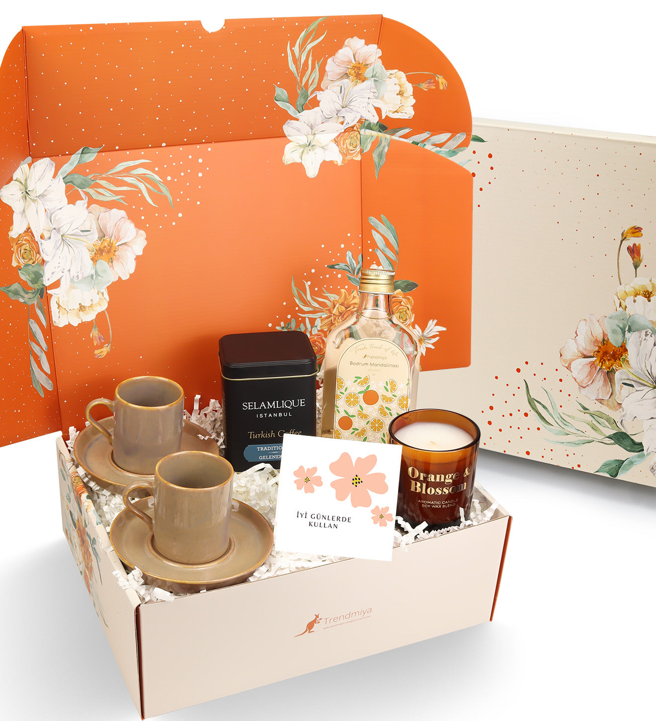 Set içeriği: 2 Adet Porselen Kahve Fincan & 1 Adet Trendmiya Bodrum Mandalinası & 1 Adet Turuncu Bardak Mum & 1 Adet 125gr Selamlıque Türk Kahvesi