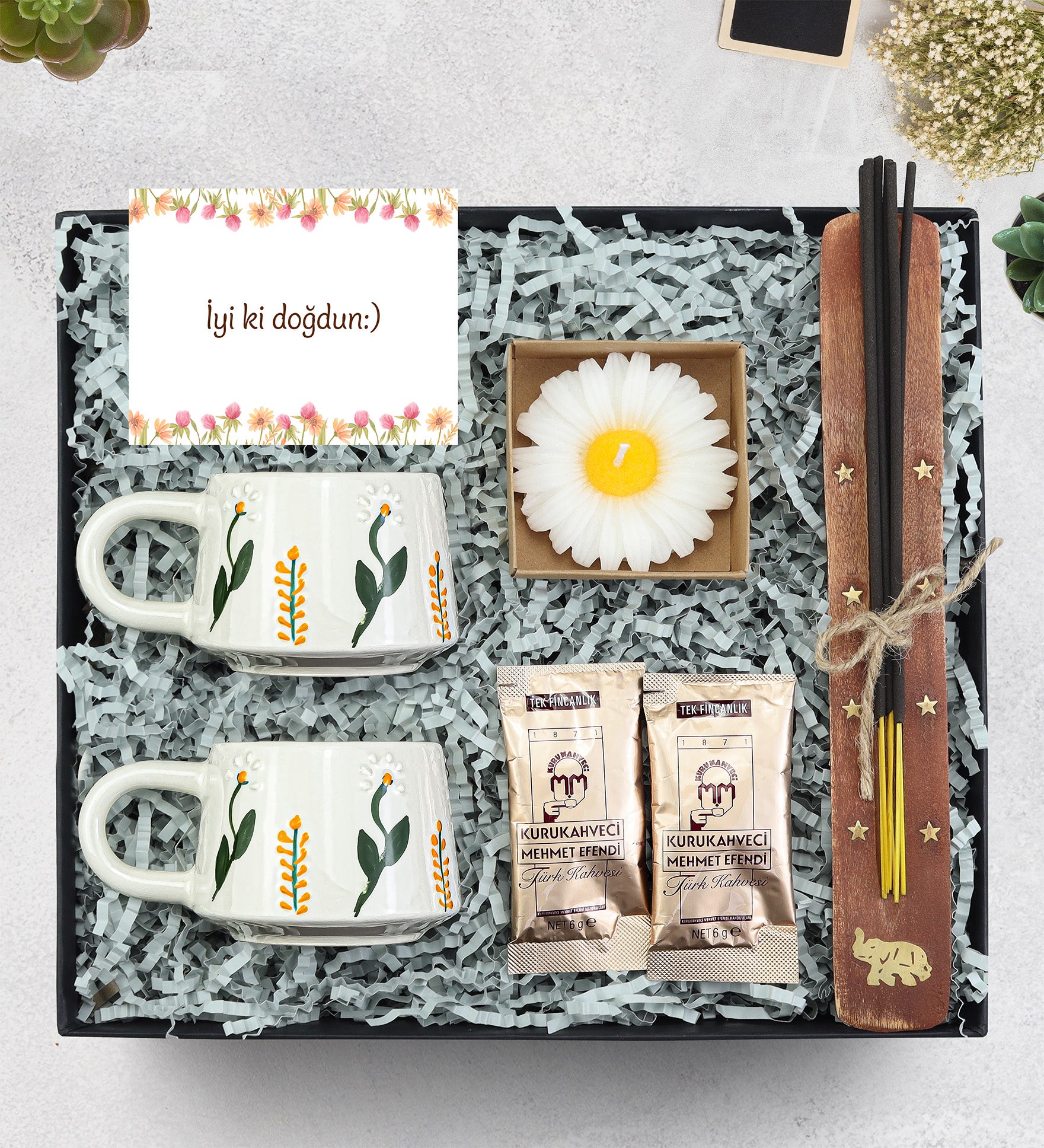 2'li El Yapımı Kupa & Tütsü & Kraft Papatya Mum & 2'li Mehmet Efendi Türk Kahvesi Hediye Seti