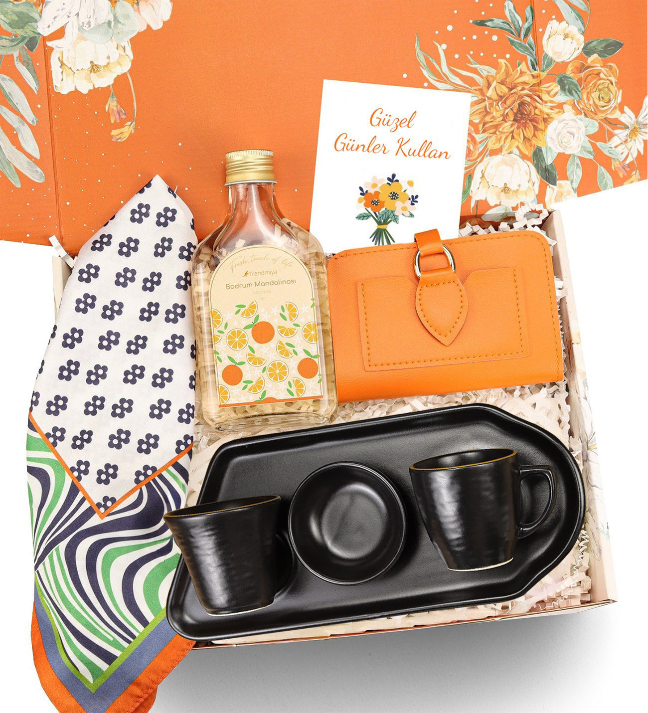 Set içeriği: 1 Adet Turuncu Fular & 1 Adet Türk Kahvesi Sunum Seti & 1 Adet Turuncu Yumuşak Deri Cüzdan & 1 Adet 200ml Trendmiya Kolonya