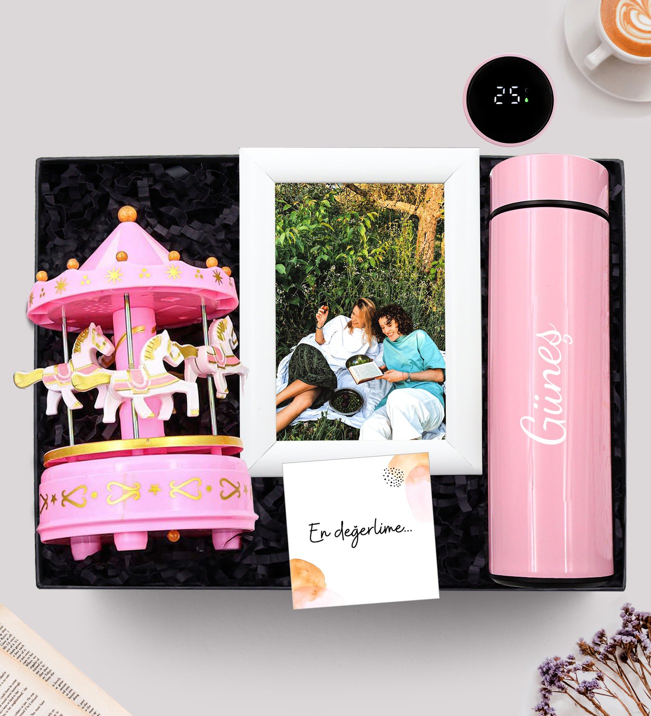 Kişiye Özel Dereceli Göstergeli 450ml Pembe Çelik Termos & Beyaz Ahşap Çerçeve & Pembe Atlı Karınca Müzik Kutusu Hediye Seti