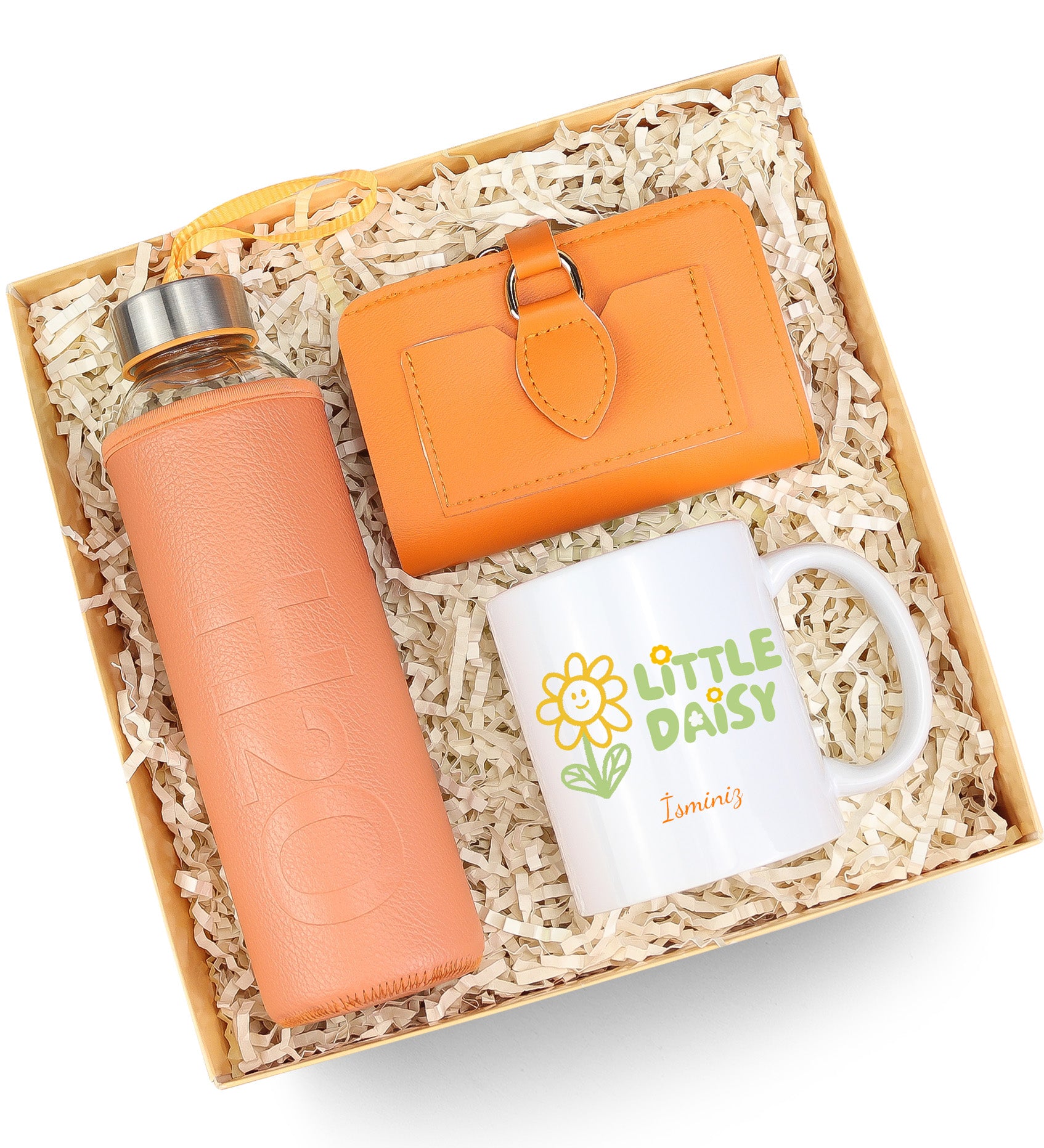 Kişiye Özel Kupa & Matara & Turuncu Cüzdan Hediye Seti