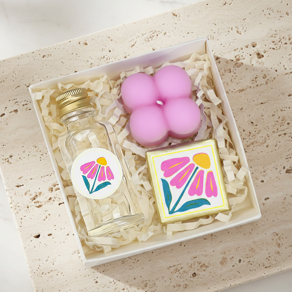 Set İçeriği : 1 Adet Mini Kolonya & 1 Adet Mini Bubble Mum & 1 Adet Madlen Çikolata