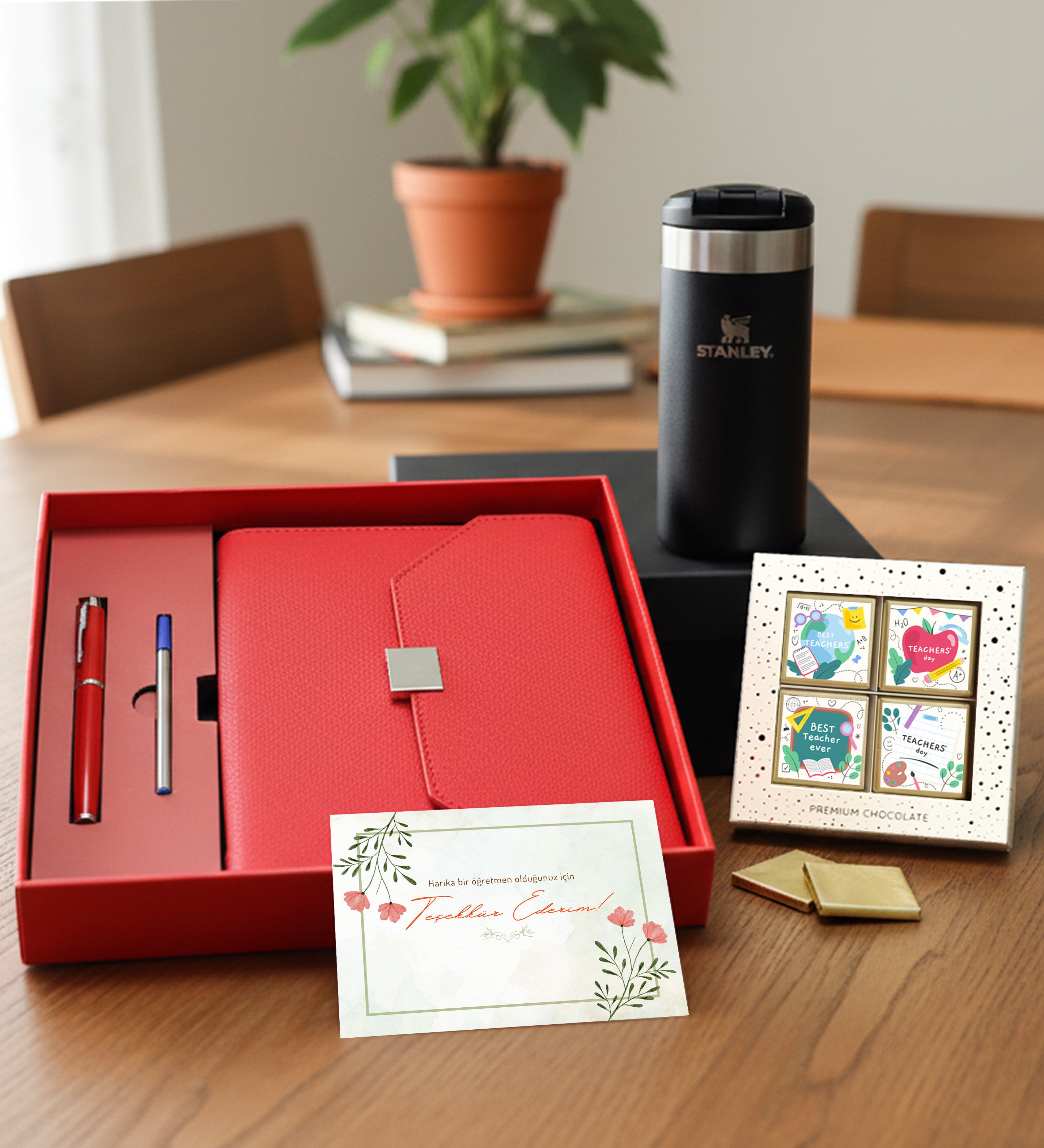 Kutulu Defter Kalem Seti & Stanley 0,35 L & Premium Madlen Öğretmen Çikolata Hediye Seti