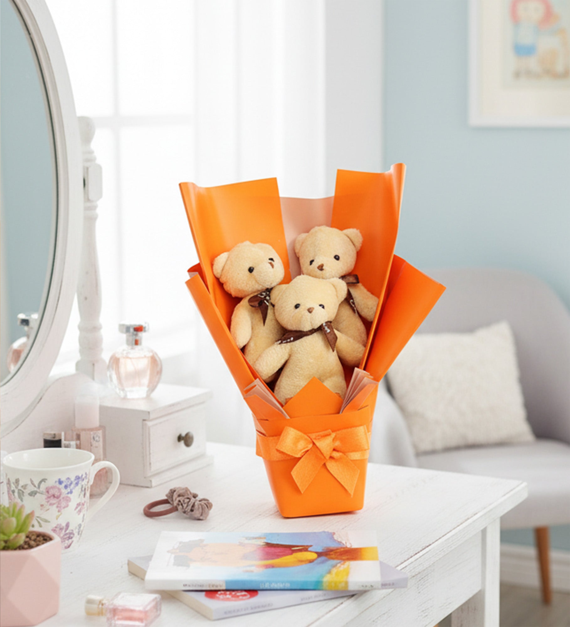 Set içeriği: 1 Adet Turuncu Dereceli Termos & 1 Adet 3'lü Ayıcık Buketi