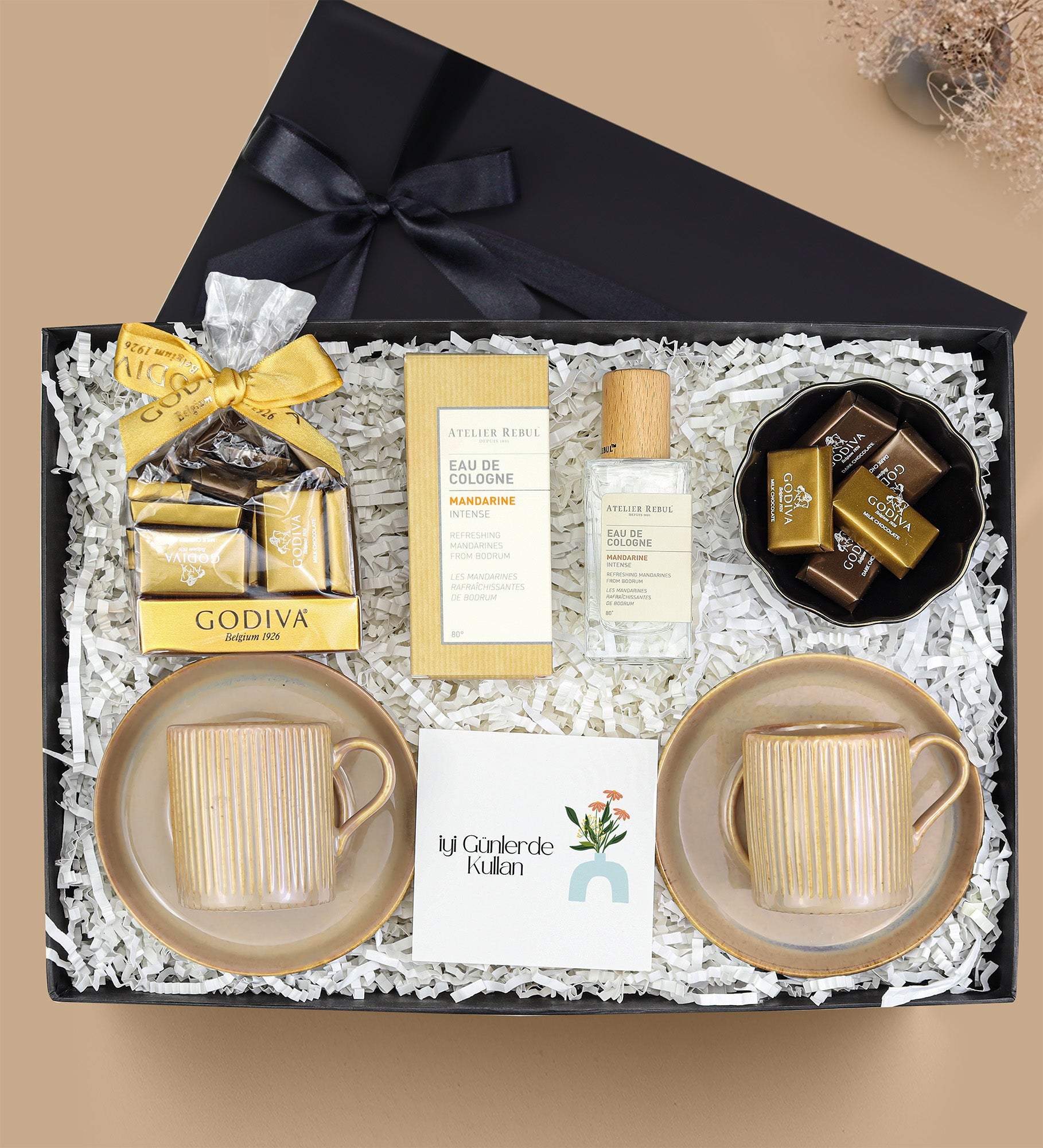 Godiva Napoliten Çikolata & Porselen Fincan & Atelier Rebul Kolonya 50 ml & Sunum Kasesi Hediye Seti