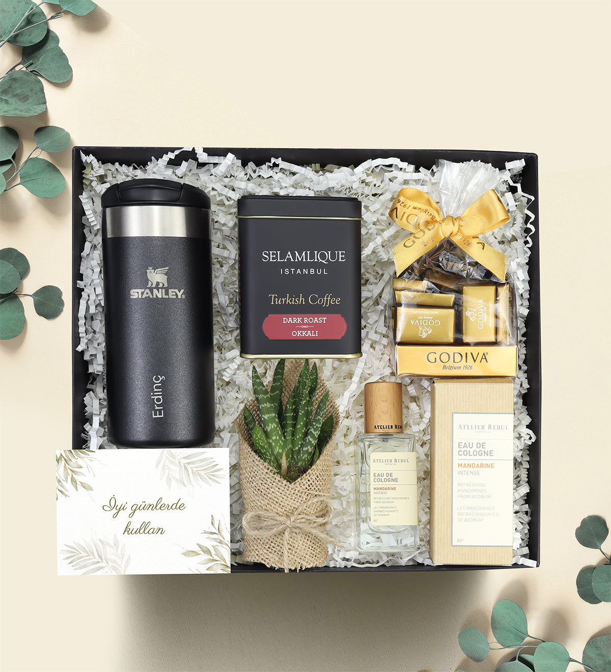 Set içeriği: 1 Adet Stanley Termos Bardak 0.35 Lt Ürün Özellikleri & 1 Adet Godiva Napoliten Çikolata & 1 Adet 125gr Selamlıque Türk Kahvesi & 1 Adet Atelier Rebul Kolonya 50 ml & 1 Adet Canlı Sukulent Çiçek