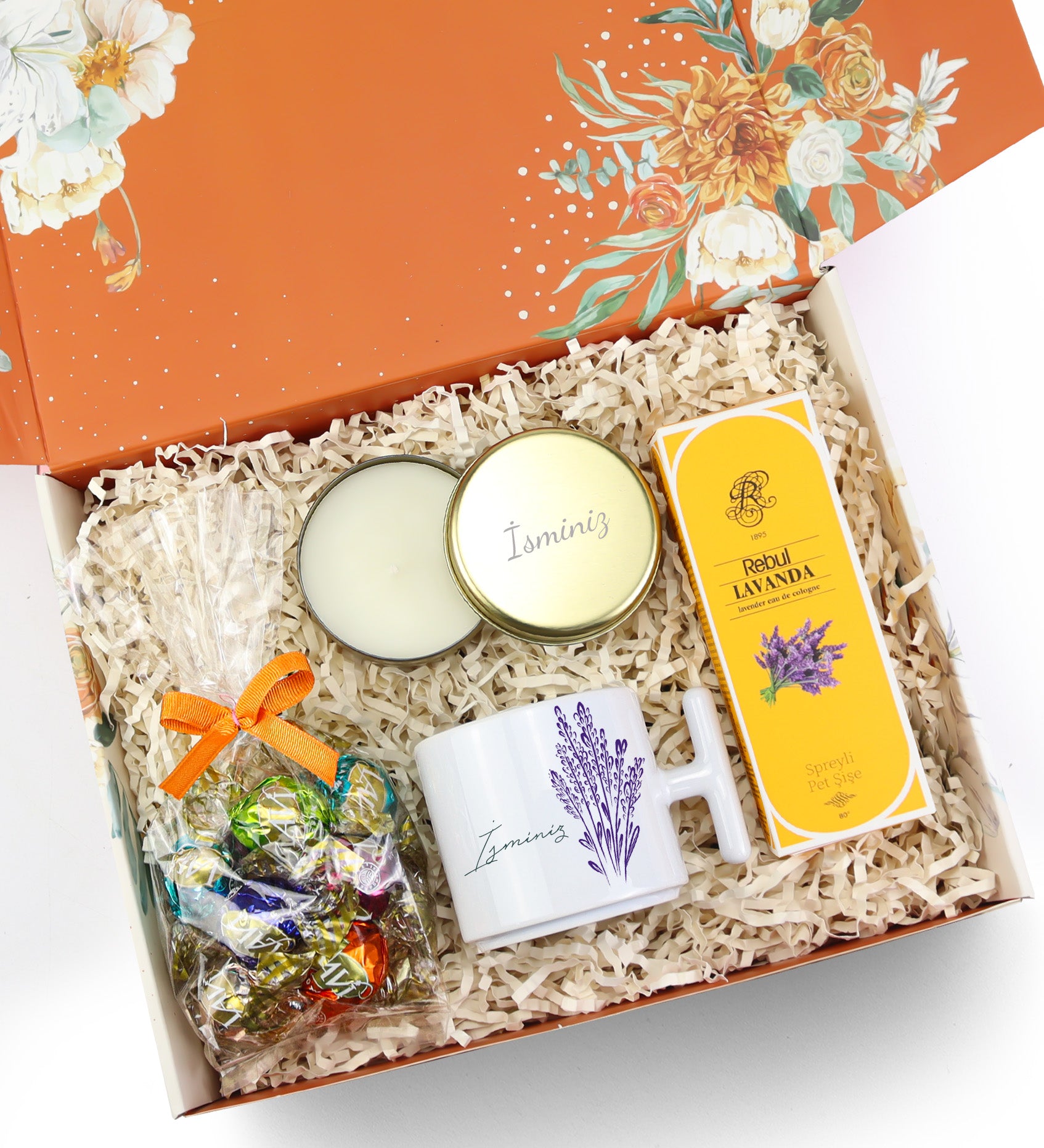 Kişiye Özel Mum & Lavi Çikolata & Rebul Kolonya & T Kupa Hediye Seti