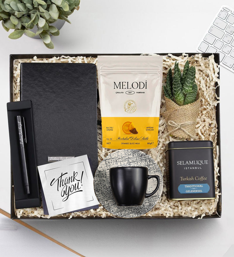 Set İçeriği: 1 Adet Siyah Defter & 1 Adet Siyah Mat Roller Kalem & 1 Adet Siyah Mat Fincan & 1 Adet Melodi Çikolatalı Portakal Dilimi & 1 Adet Canlı Sukulent Çiçek & 1 Adet Selamlıque Türk Kahvesi