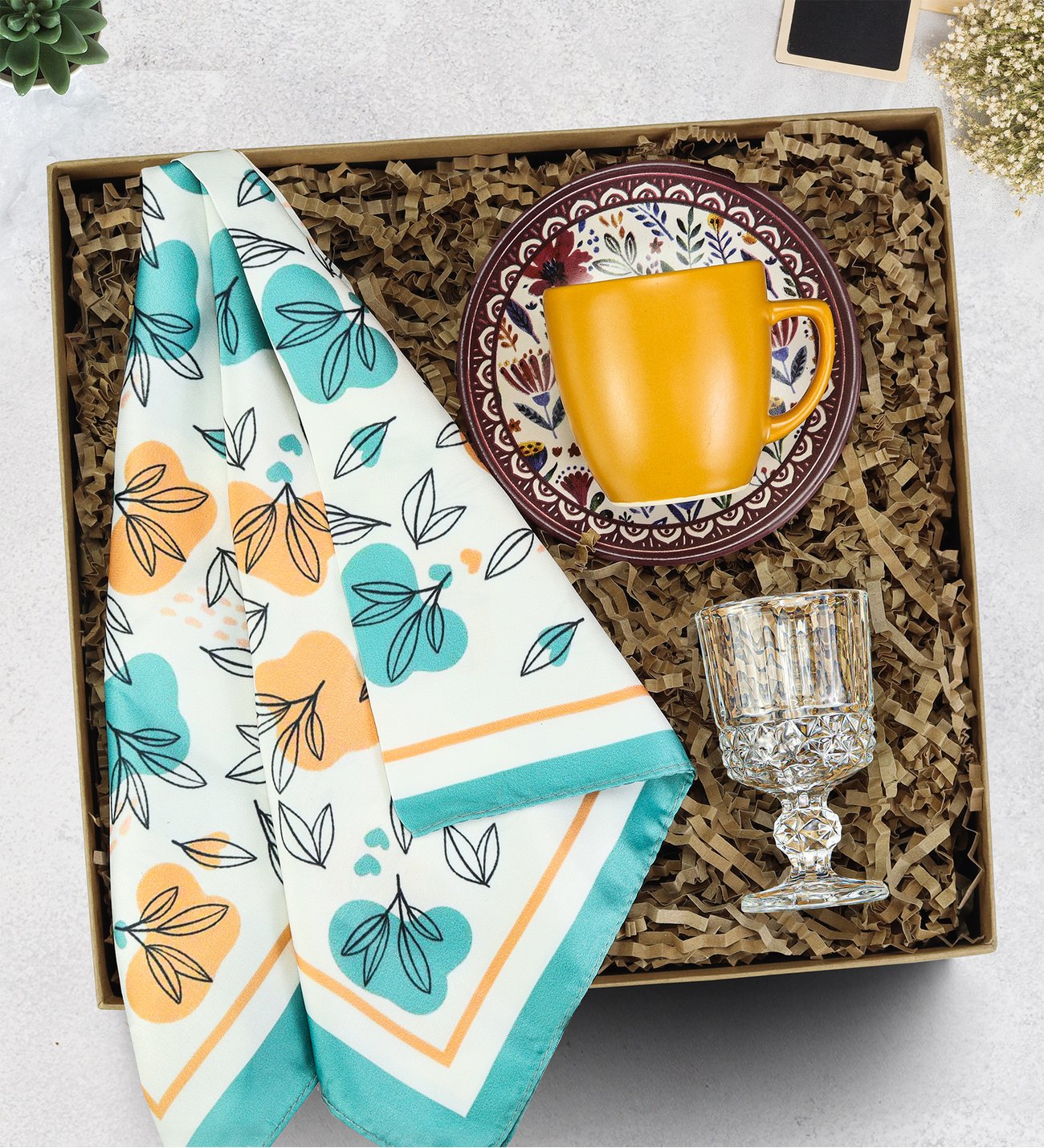 Turuncu Türk Kahvesi Fincanı & Kahve Yanı Su Kadehi & Yaprak Detaylı Fular Hediye Seti