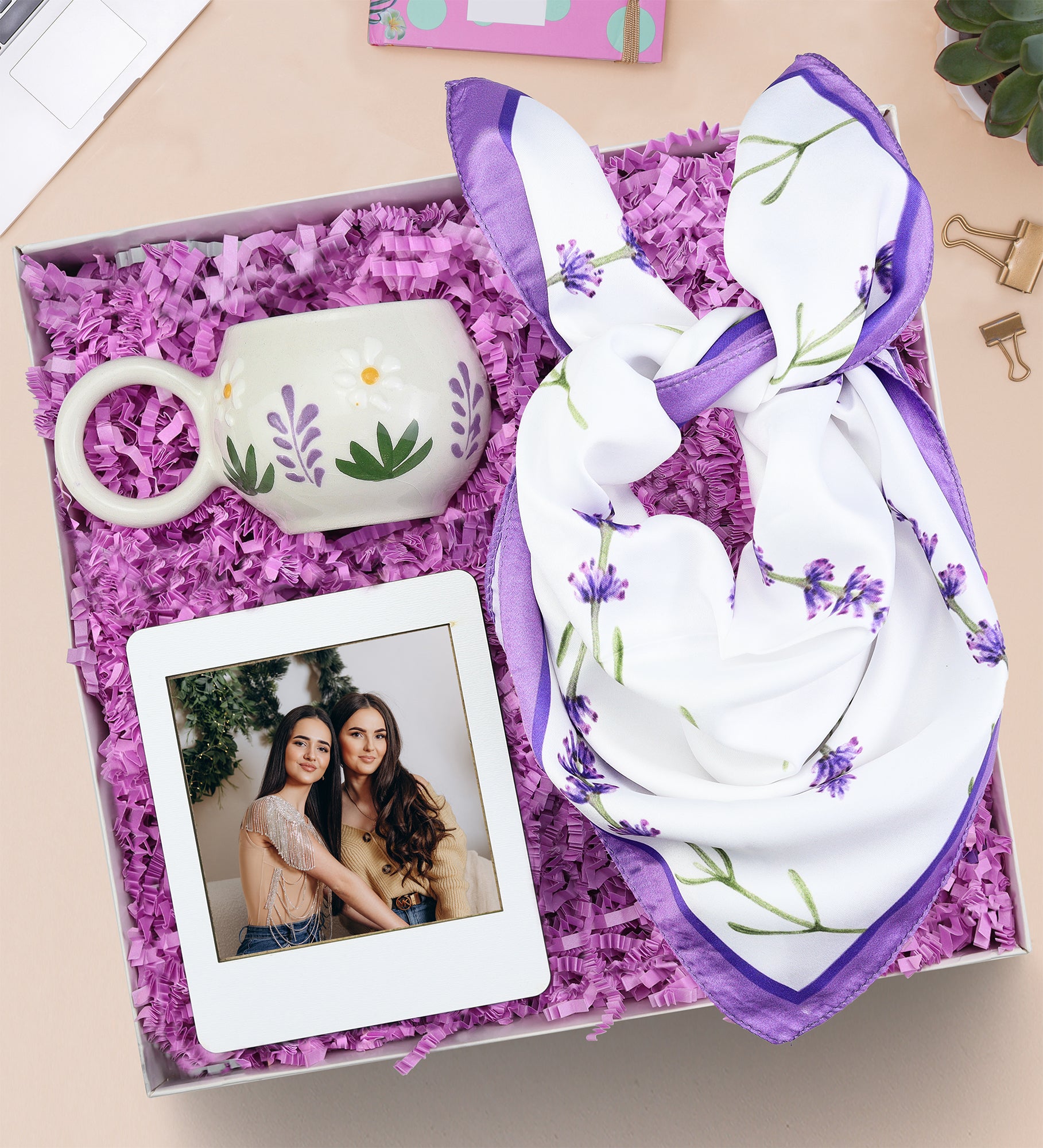 El Yapımı Kupa & Lavanta Desenli Tasarım Fular & İnstagram Çerçeve Hediye Seti