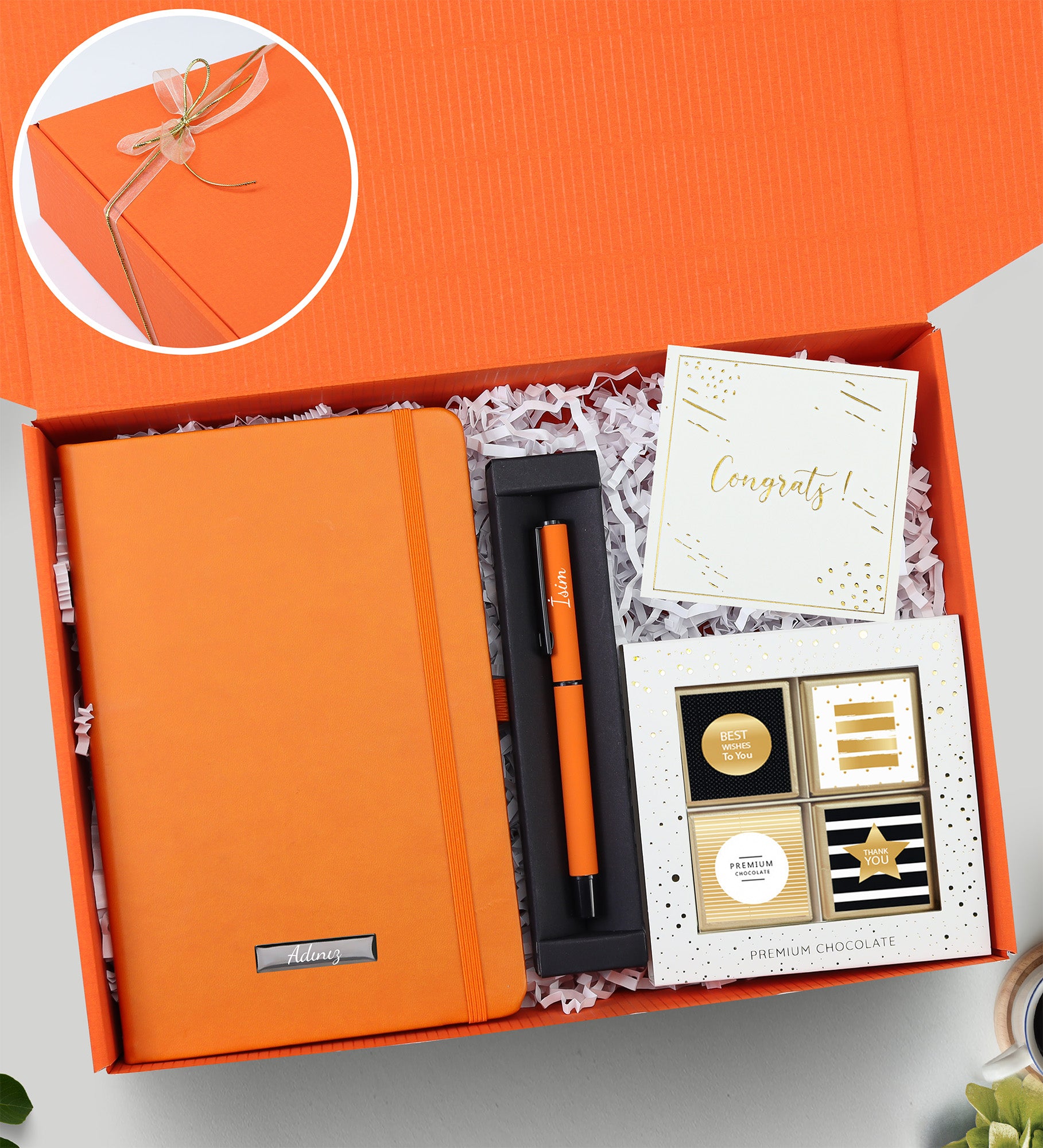 Turuncu Defter & Roller Kalem & Premium Madlen Çikolata Hediye Seti