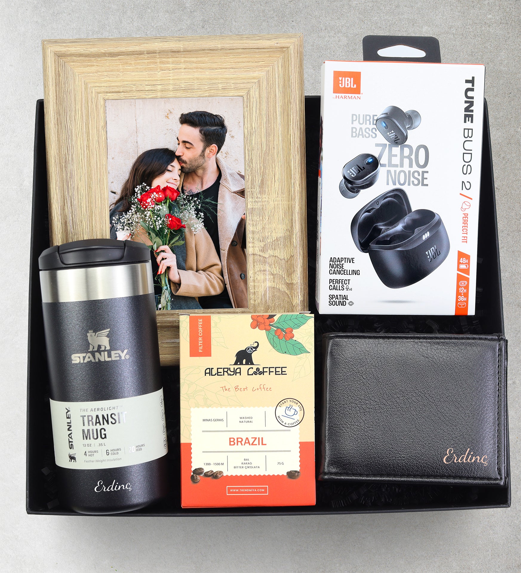 Set içeriği: 1 Adet Stanley Termos & 1 Adet Alerya Filtre Kahve & 1 Adet Çerçeve & 1 Adet JBL Bluetooth Kulak İçi Kulaklık & 1 Adet Suni Deri Erkek Cüzdan