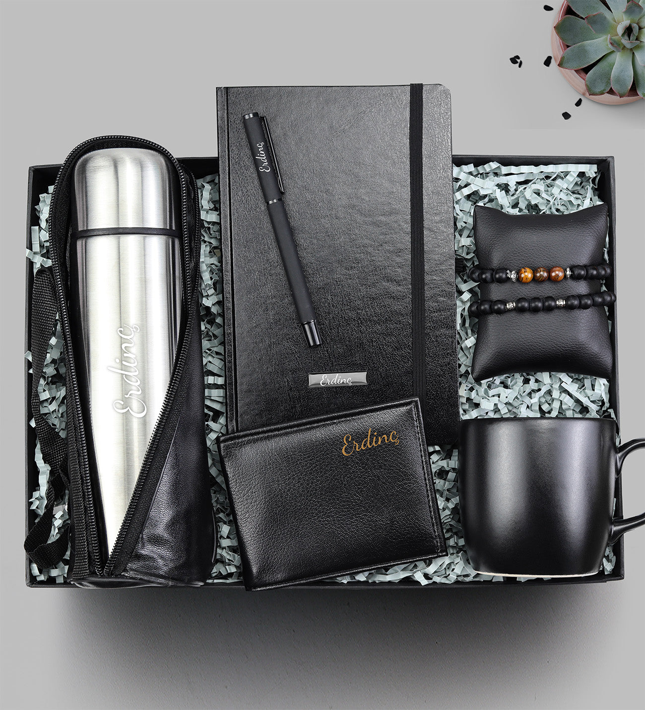 Set içeriği: 1 Adet Kişiye Özel 500 ML Çantalı Termos & 1 Adet Siyah Defter & 1 Adet Siyah Kalem & 2 Adet Kaplan Gözü Bileklik & 1 Adet Siyah Suni Deri Cüzdan & 1 Adet Siyah Kupa