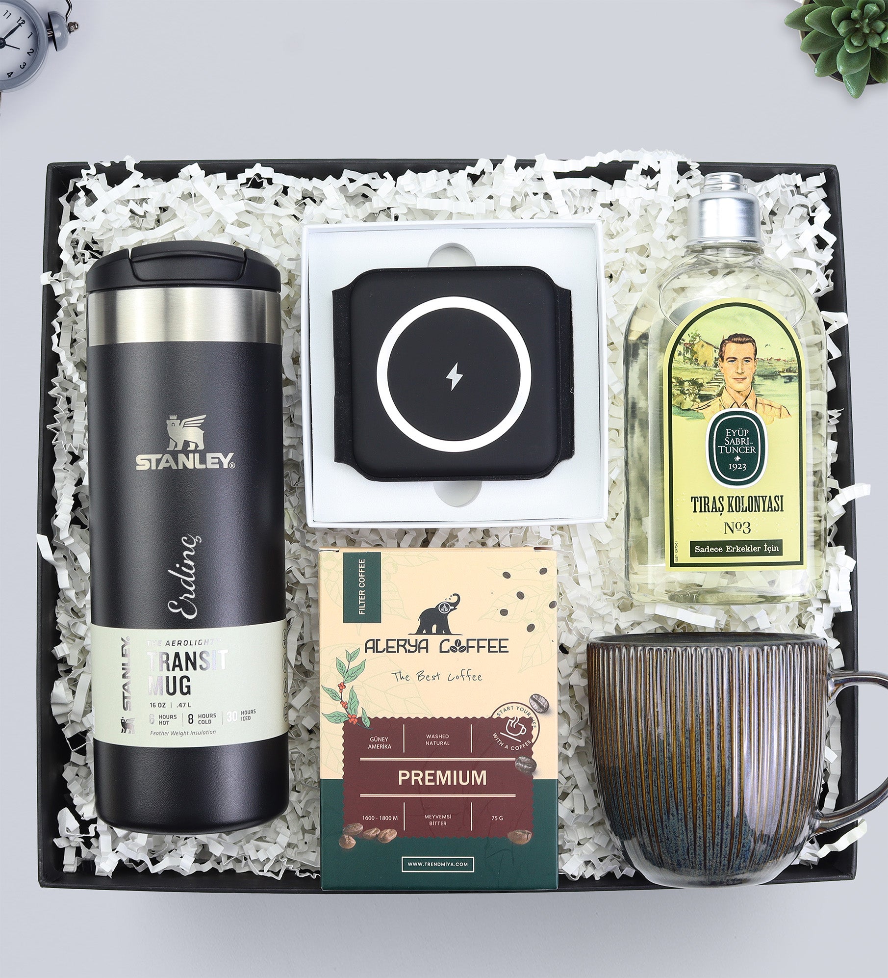Set içeriği: 1 Adet Stanley Termos & 1 Adet Çoklu Kablosuz Şarj Standı & 1 Adet Alerya Filtre Kahve & 1 Adet Porselen Kupa & 1 Adet Eyüp Sabri Tuncer Tıraş Kolonyası