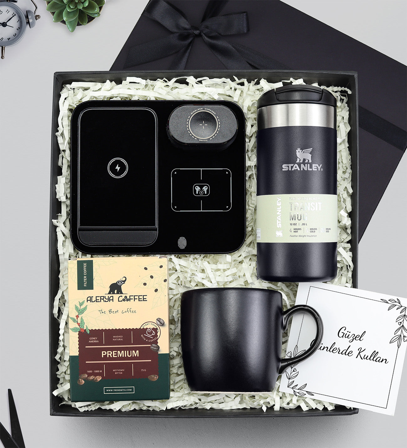 Wireless Masa Üstü Şarj Standı & 0,35 L Stanley Termos & Siyah Kupa & Pemium Filtre Kahve Hediye Seti
