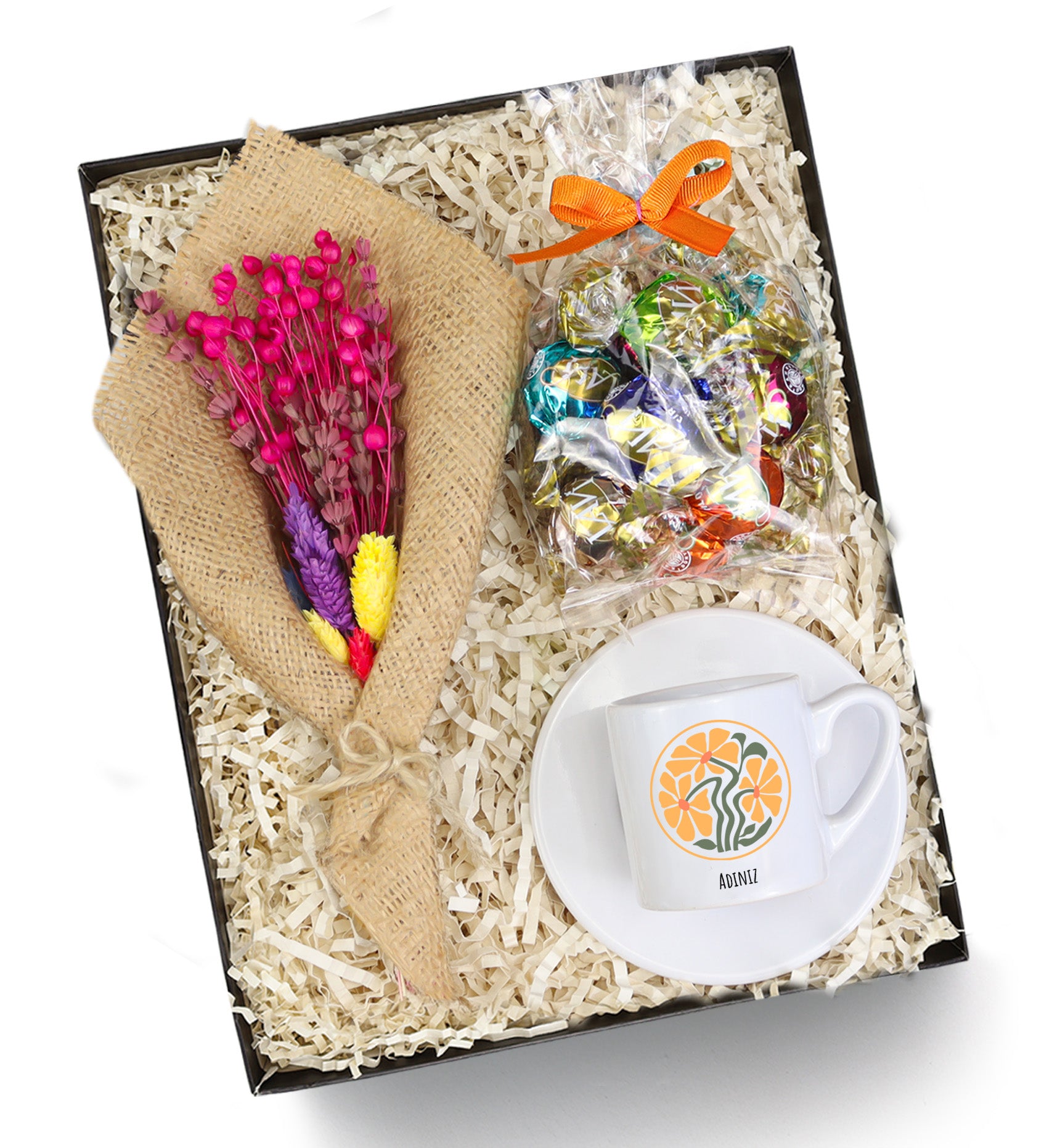 Set içeriği: 1 Adet Baskılı Fincan & 1 Adet Kurutulmuş Çiçek Buketi & 1 Adet Lavi Çikolata