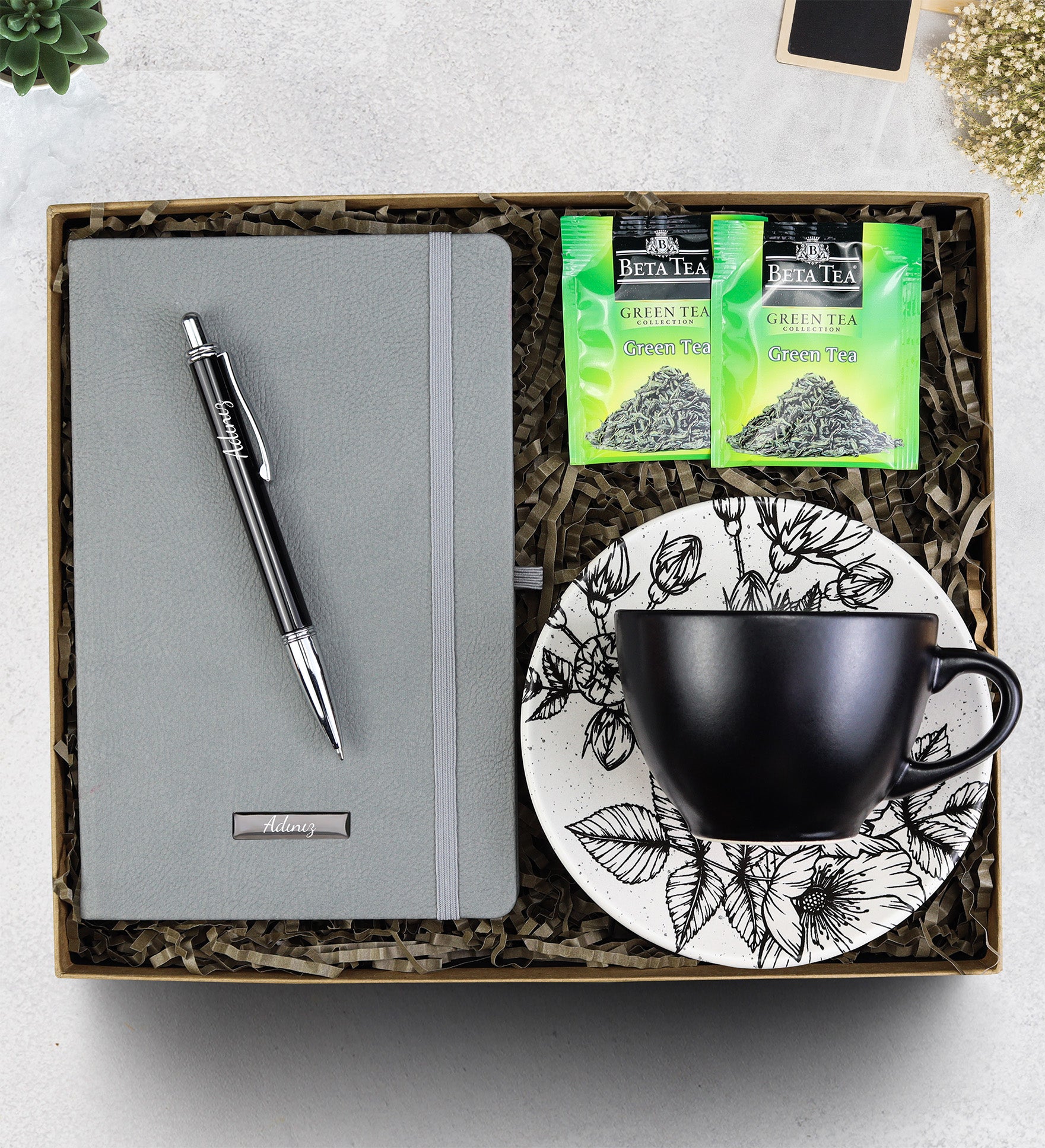 Gri Defter & Siyah Tükenmez Kalem & Siyah Çay Ve Kahve Fincanı & 2'li Yeşil Çay Hediye Seti
