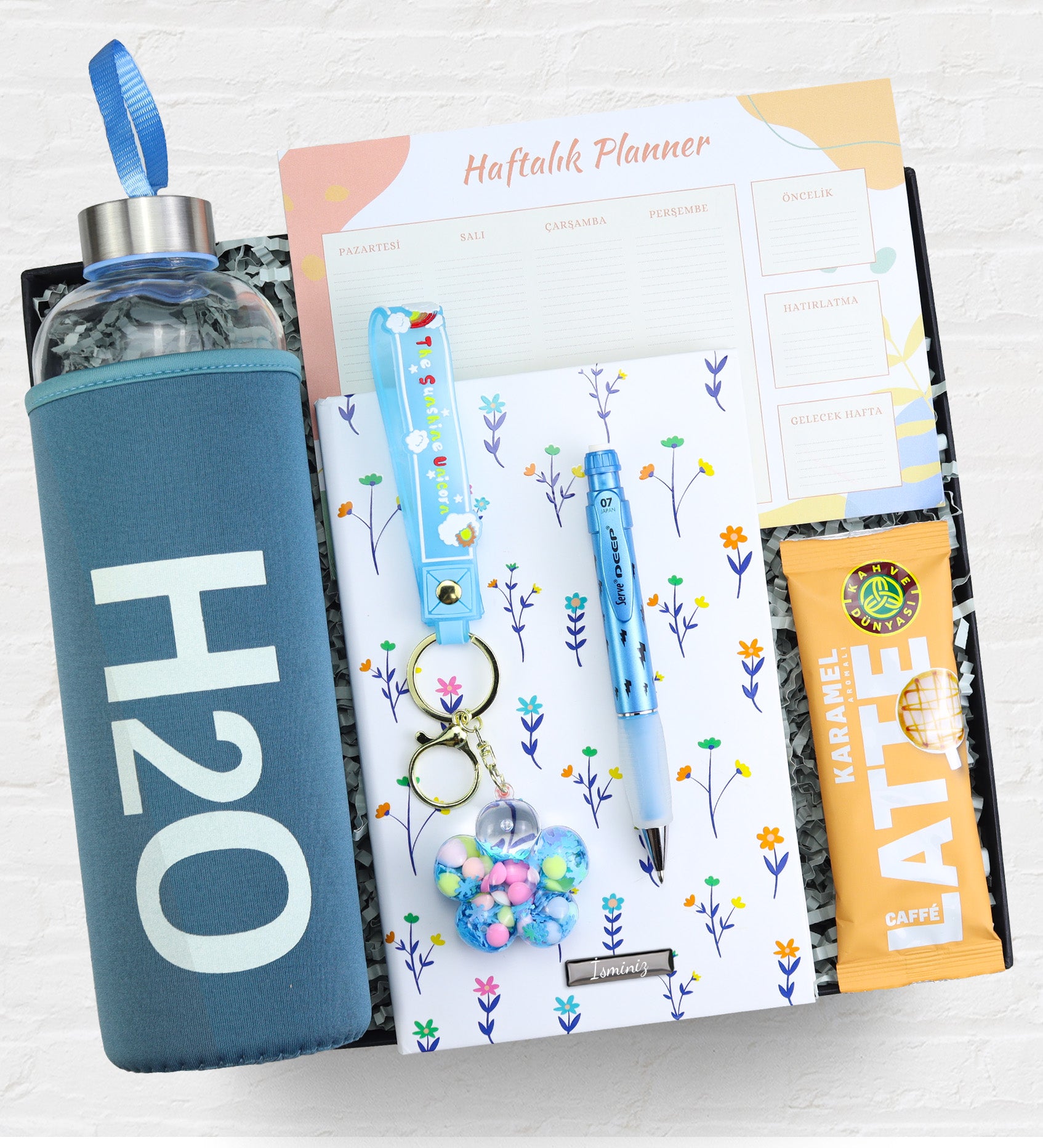 Set içeriği: 1 Adet Defter & 1 Adet Bez Kılıflı 1000 ml Cam Matara & 1 Adet Figürlü Anahtarlık & 1 Adet Kahve Dünyası Vanilya Latte & 1 Adet Kalem