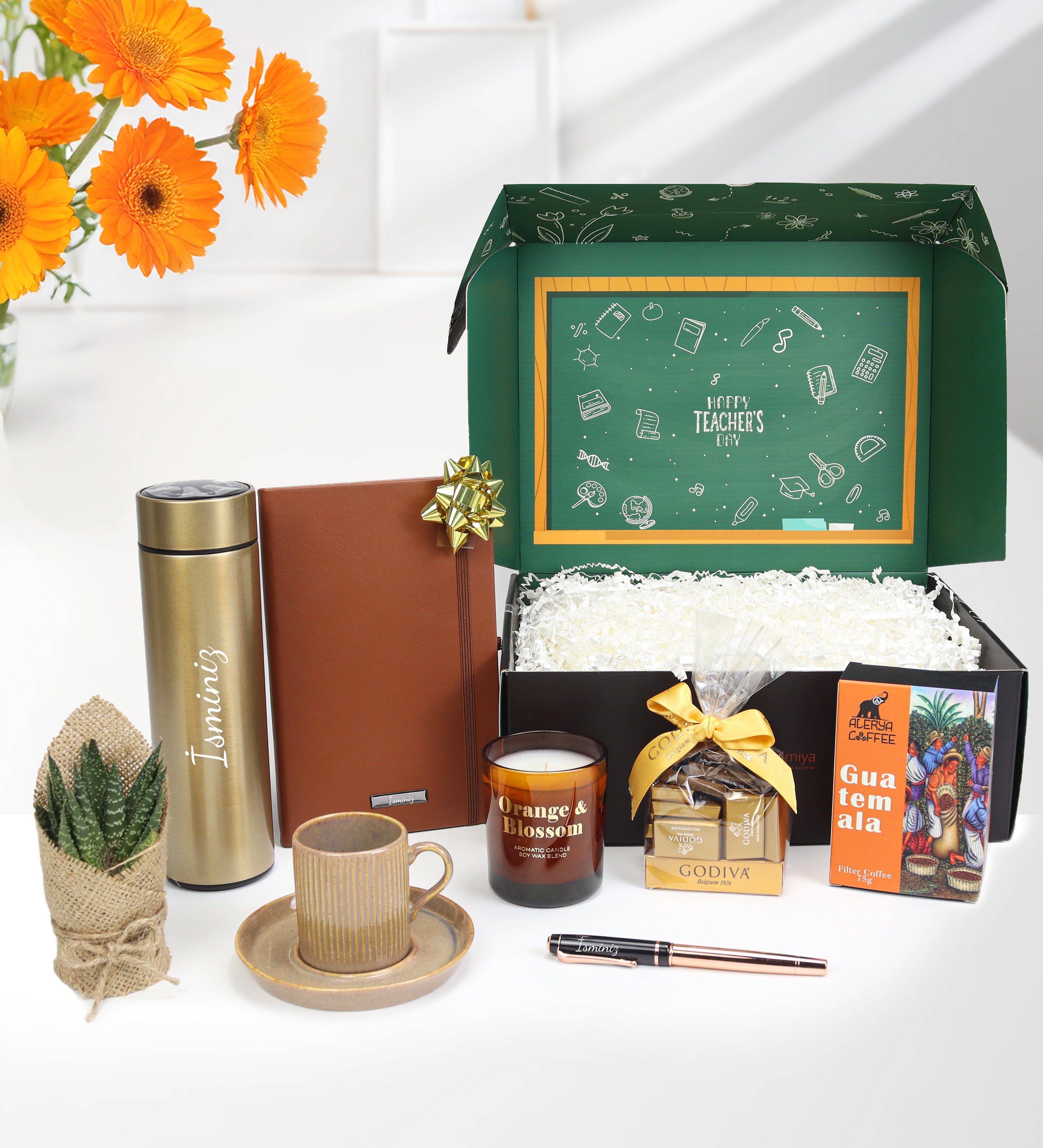Set içeriği: 1 Adet Çizgili Porselen Kahve Fincanı & 1 Adet Kişiye Özel Kahverengi Defter & 1 Adet Metalik Roller Kalem & 1 Adet Kişiye Özel 500 ML Gold Renk Dereceli Termos & 1 Adet Godiva Çikolata & 1 Adet Canlı Sukulent Çiçek & 1 Adet Alerya Guatemala Filtre Kahve & 1 Adet Bardak Mum