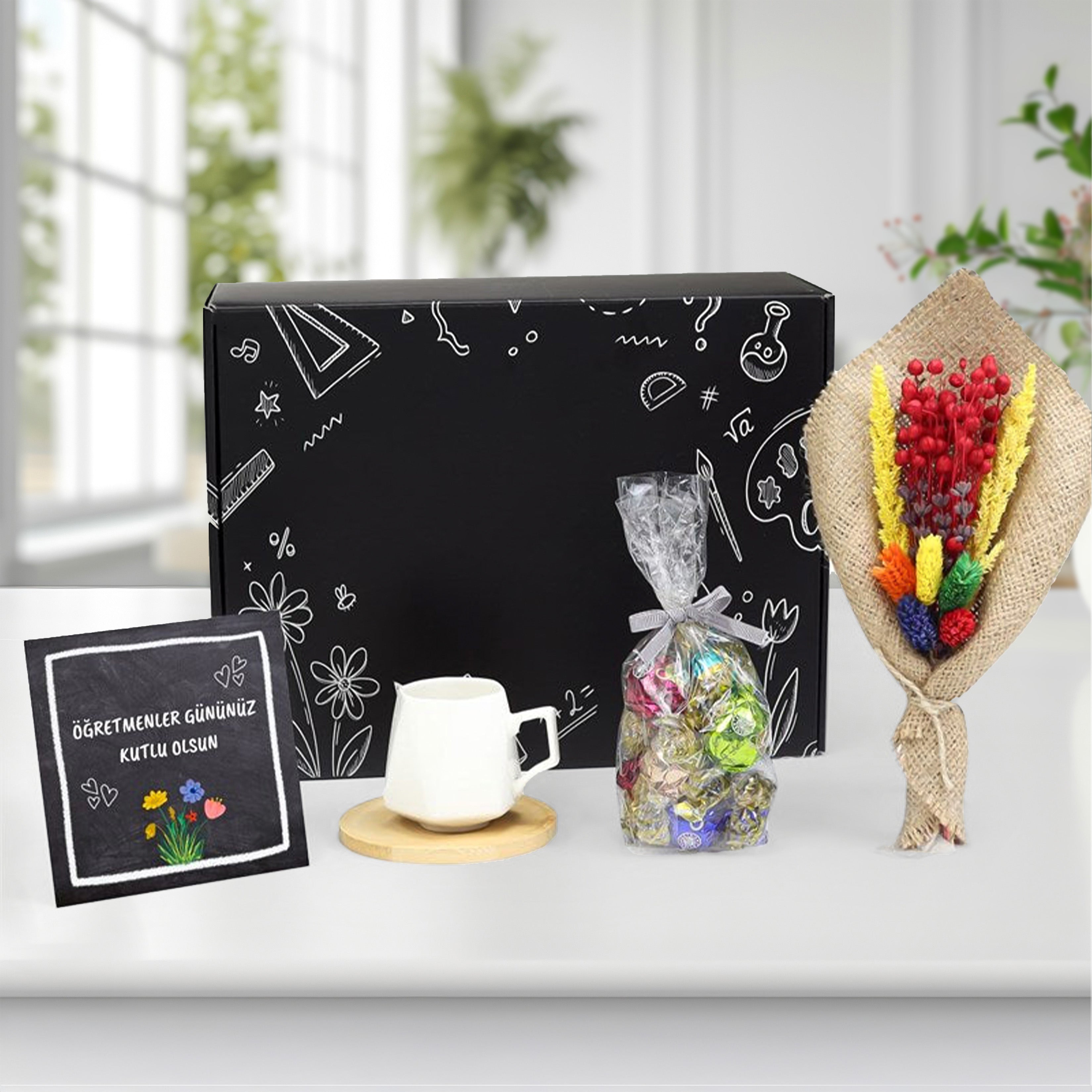 Set İçeriği: 1 Adet Kurutulmuş Çiçek Buketi & 1 Adet Bambu Tabaklı Beyaz Fincan & 1 Adet Lavi Çikolata