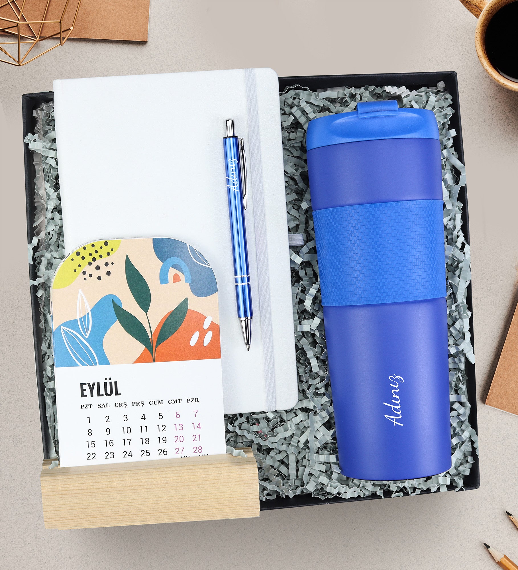 Kişiye Özel Defter & Kalem & Masa Takvimi & French Pressli Termos Hediye Seti