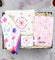 Kişiye Özel Pembe Desenli Defter & Ham Bez El Çantası & Tasarım T Kupa & Gümüş Renk Detaylı Beyaz Tükenmez Kalem & Beyaz Pembe Desenli Fular Hediye Seti