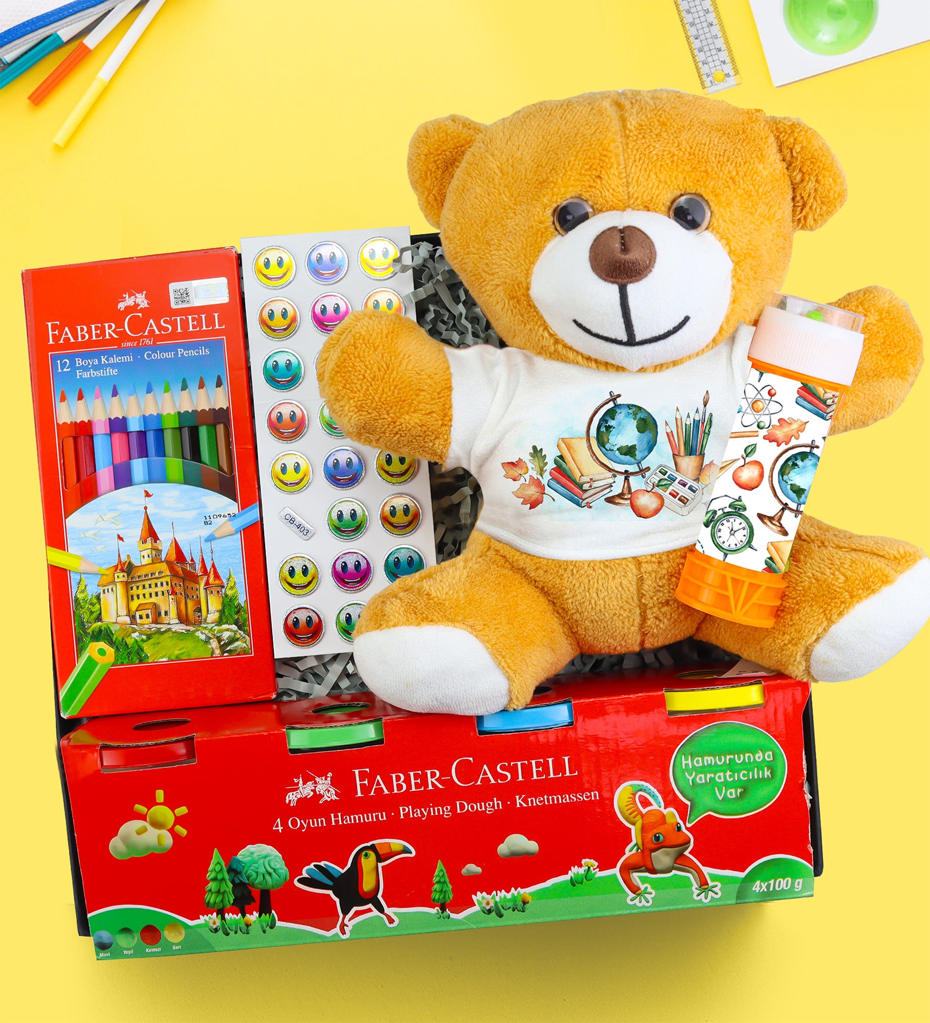 Set İçeriği: 1 Adet Faber Castell 12'li Kuru Boya & 1 Adet Faber Castell 12'li Sulu Boya & 1 Adet Stickers & 4 Adet Oyun Hamuru & 1 Adet Peluş Ayıcık & 1 Adet Köpük Baloncuk