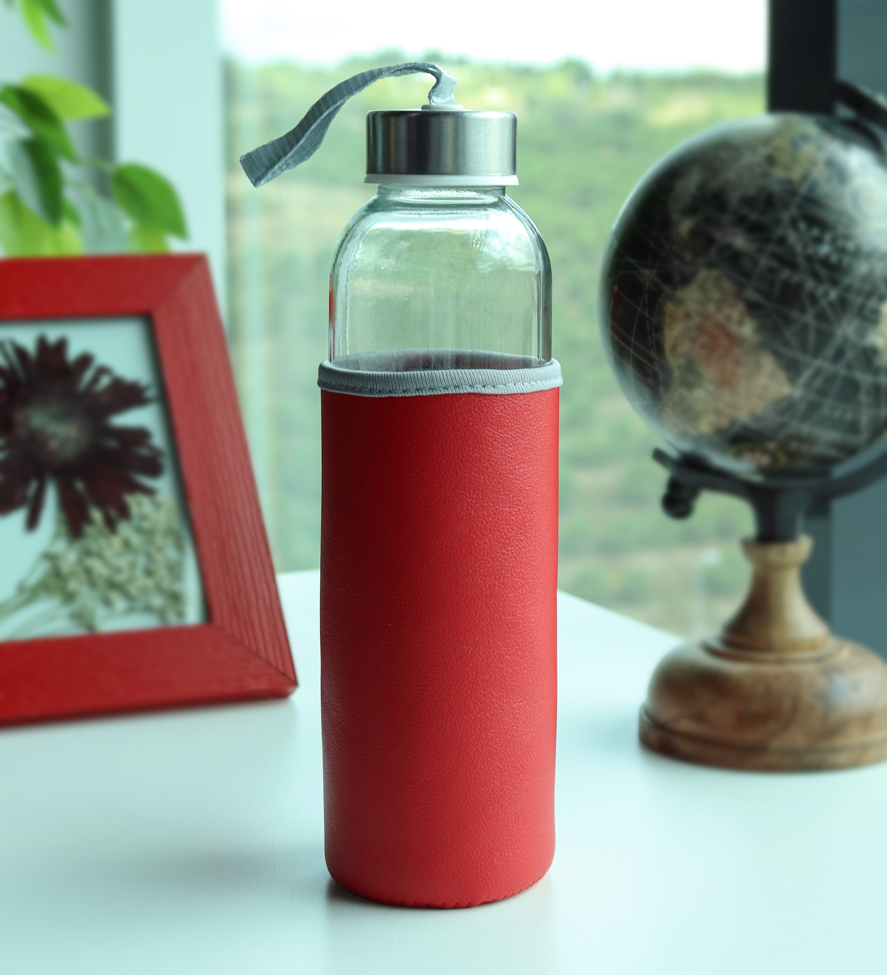 Özel Deri Kılıflı 500 Ml Kırmızı Su Matarası