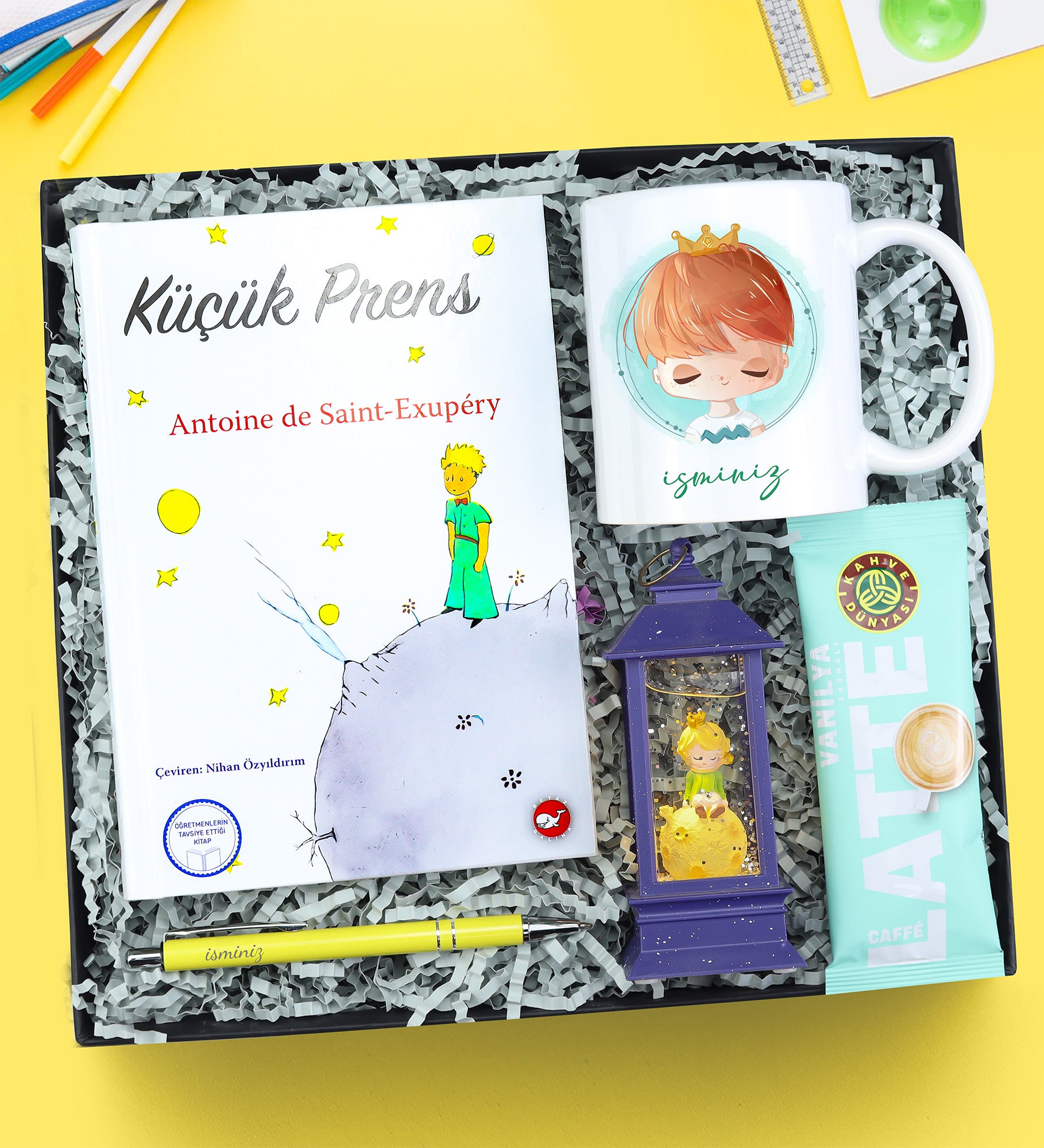 Set İçeriği: 1 Adet Küçük Prens Kitabı & 1 Adet Kahve Dünyası Vanilya Latte & 1 Adet Gümüş Detaylı Tükenmez Kalem & 1 Adet Kar Küresi & 1 Adet Baskılı Beyaz Kupa Bardak