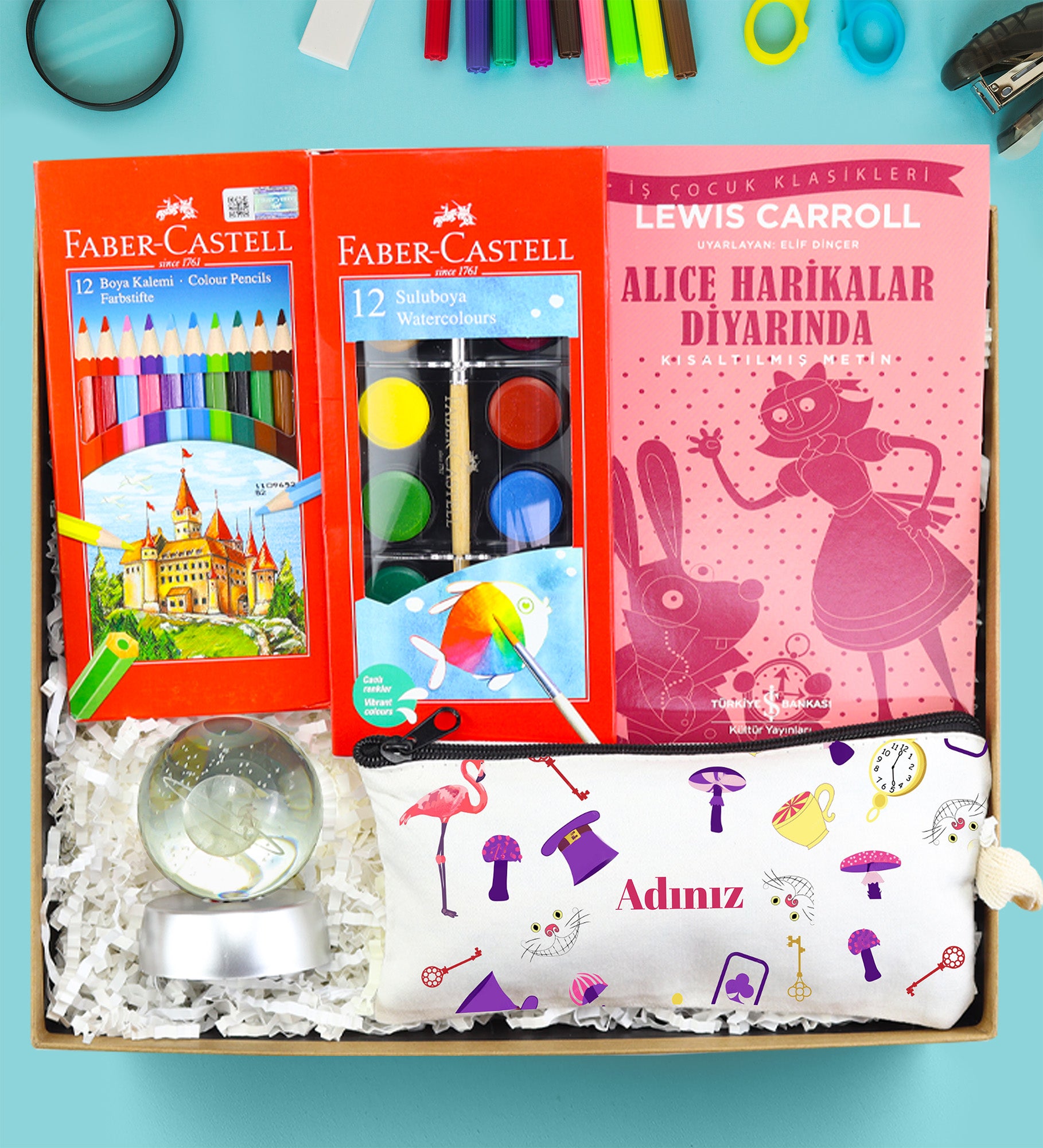Set İçeriği: 1 Adet Faber Castell 12'li Kuru Boya & 1 Adet Faber Castell 12'li Sulu Boya & 1 Adet Baskılı Ham Bez Kalemlik & 1 Adet Küre & 1 Adet Kitap