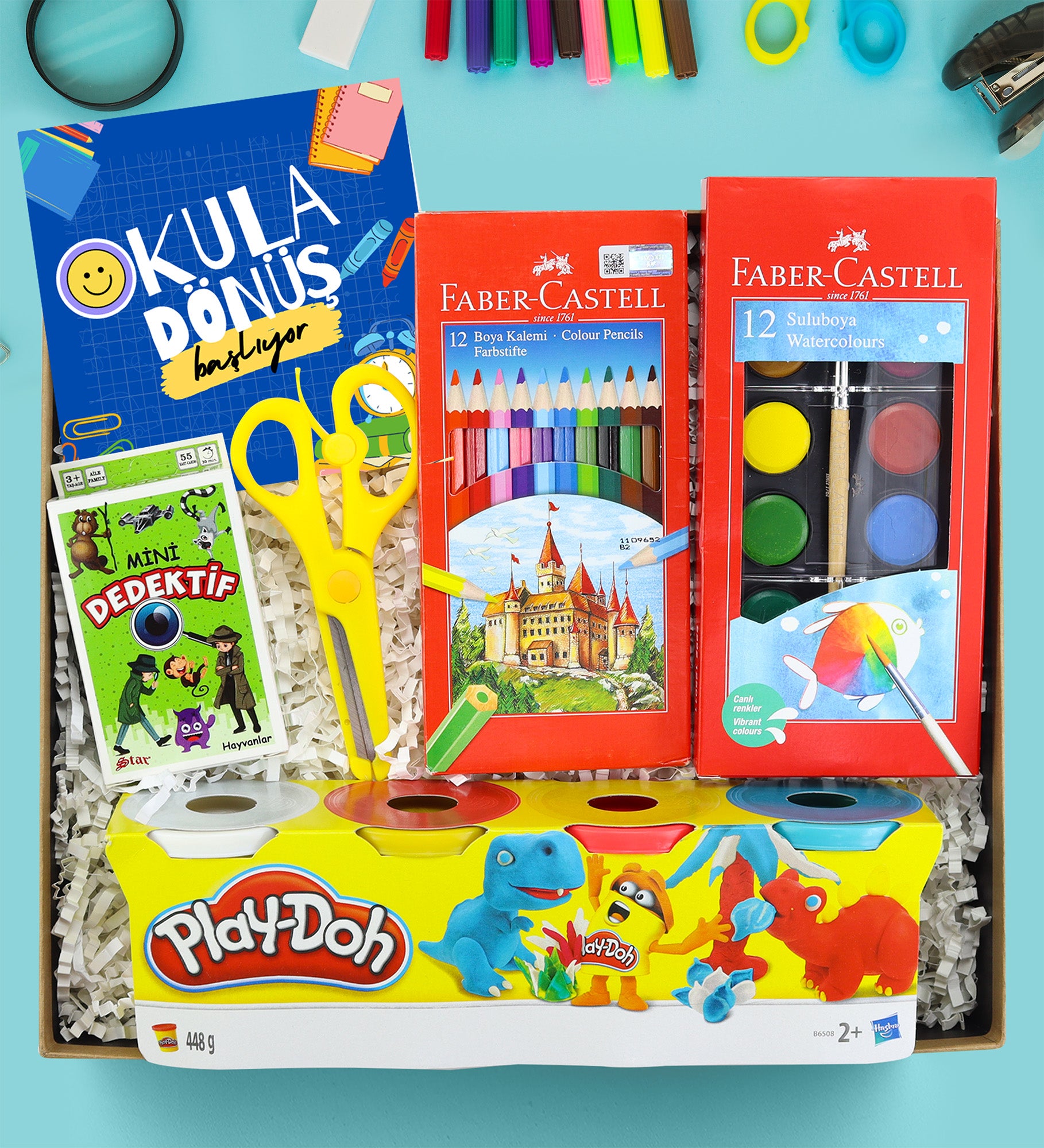Set İçeriği: 1 Adet Faber Castell 12'li Kuru Boya & 1 Adet Faber Castell 12'li Sulu Boya & 1 Adet Star Mini Dedektif Kart Oyunu & 1 Adet Oyun Hamuru & 1 Adet Makas