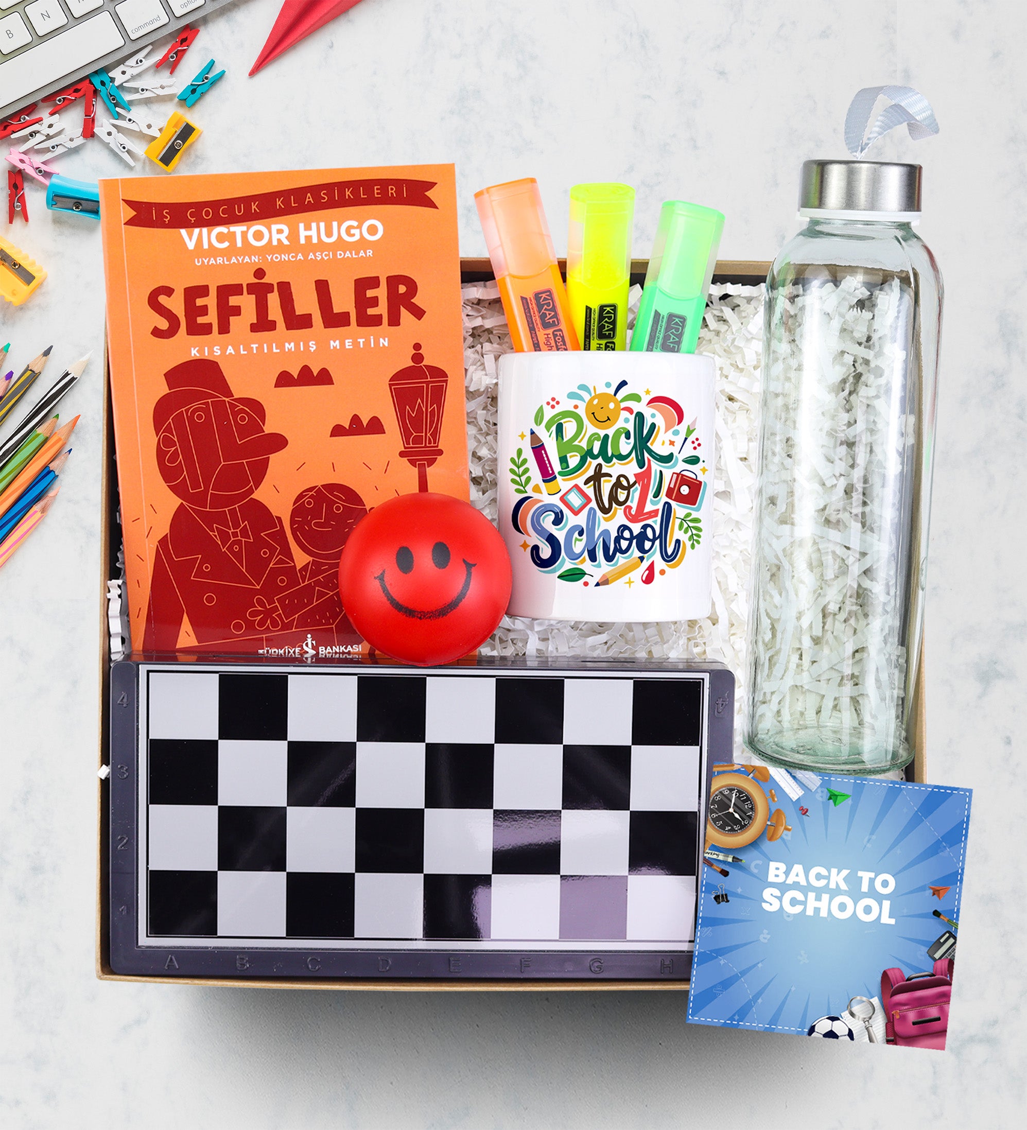 Set içeriği: 1 Adet Sefiller & 1 Adet Matara & 1 Adet Kalemlik & 3 Adet Fosforlu Kalem & 1 Adet Manyetik Satranç - Tavla - Dama & 1 Adet Gülen Yüz Top