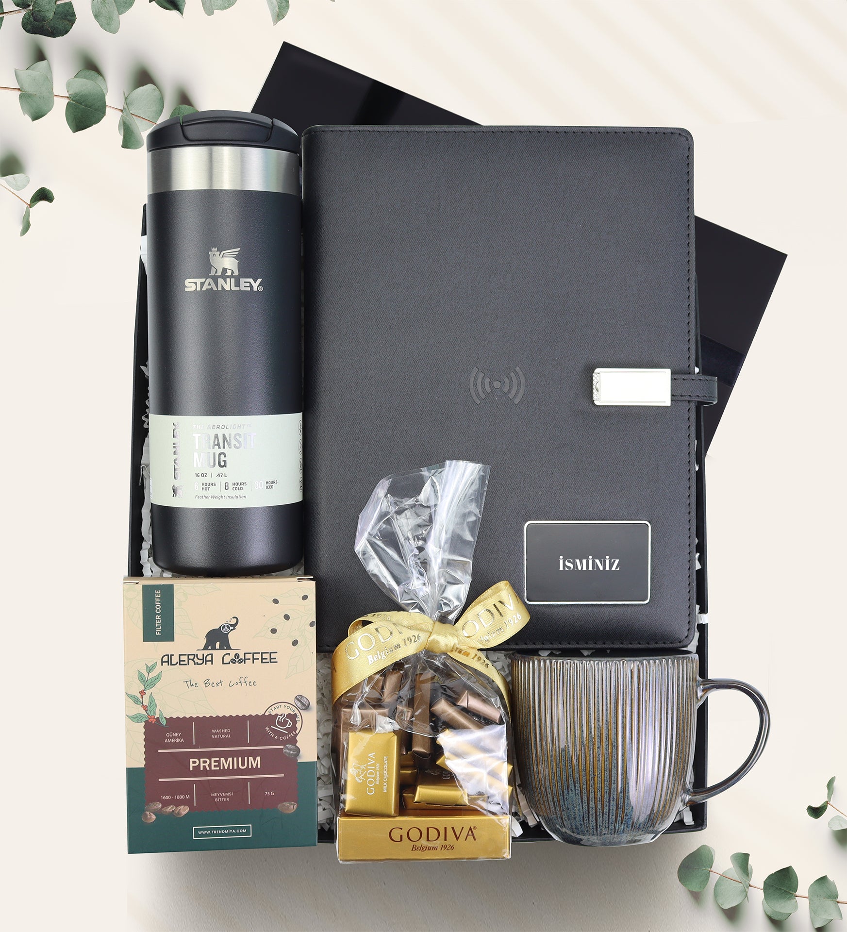 Set içeriği: 1 Adet Stanley Transit Mug Termos 0,47 L & 1 Adet Porselen Kupa & 1 Adet Godiva Napoliten Çikolata & 1 Adet 75gr Alerya Filtre Kahve & 1 Adet Powerbank Organizer 8.000 mah