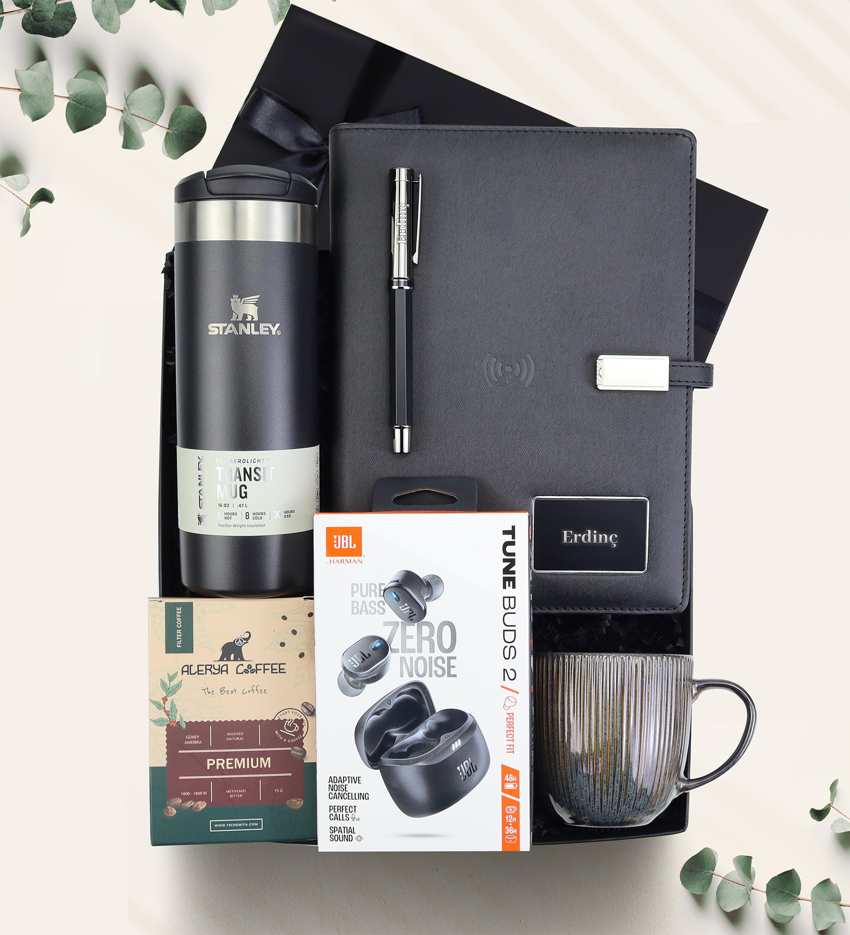 Set İçeriği: 1 Adet Stanley Transit Mug Termos 0,47 L & 1 Adet JBL Bluetooth Kulak İçi Kulaklık & 1 Adet Porselen Kupa & 1 Adet 75gr Alerya Filtre Kahve & 1 Adet Kalem & 1 Adet Powerbank Organizer 8.000 mah