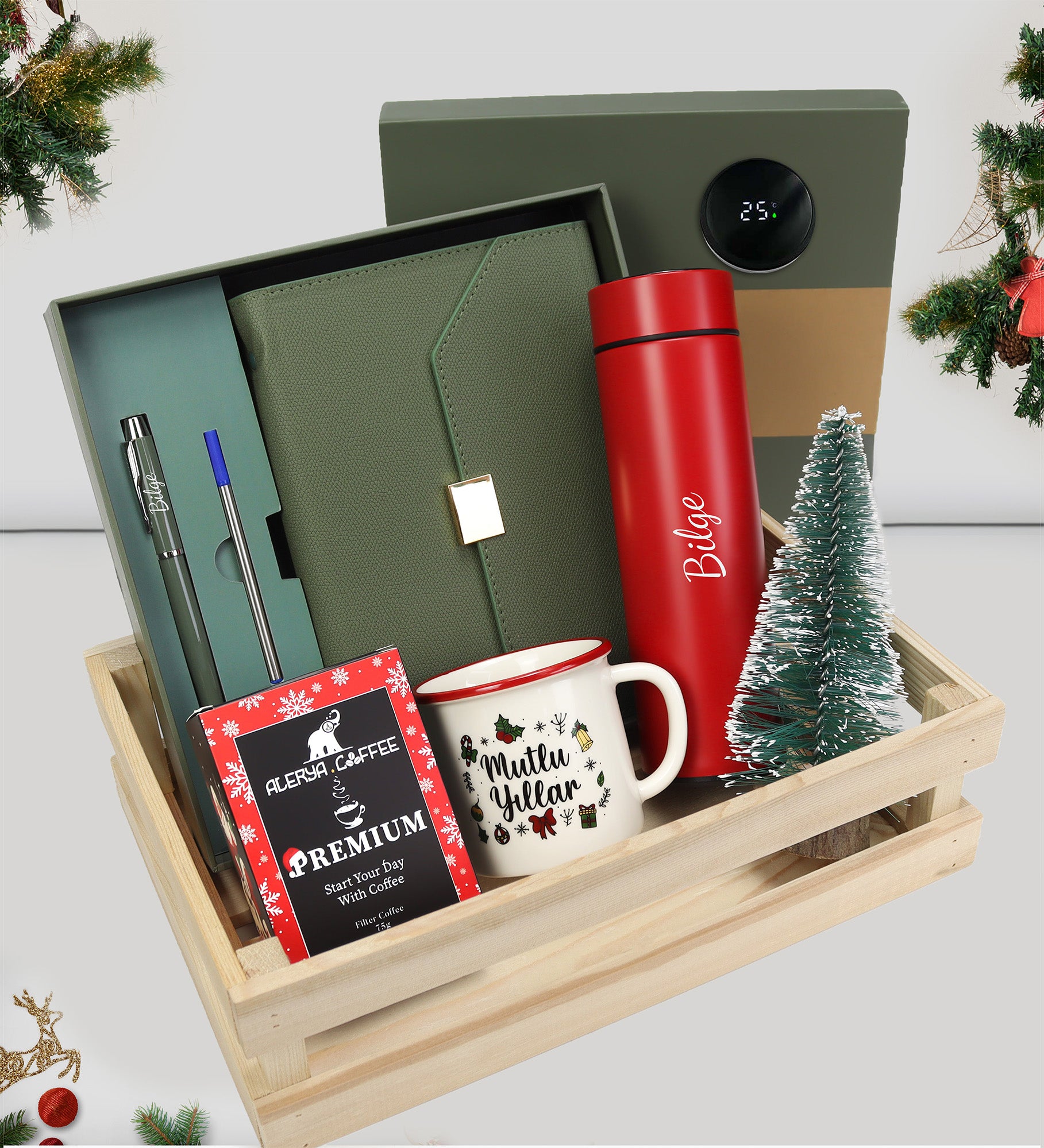 Set İçeriği: 1 Adet Kişiye Özel Kutulu Defter Kalem Seti & 1 Adet 500 ml Dereceli Kırmızı Çelik Termos & 1 Adet Mutlu Yıllar Vintage Kupa & 1 Adet Alerya Yılbaşı Filtre Kahve & 1 Adet Mini Çam Ağacı