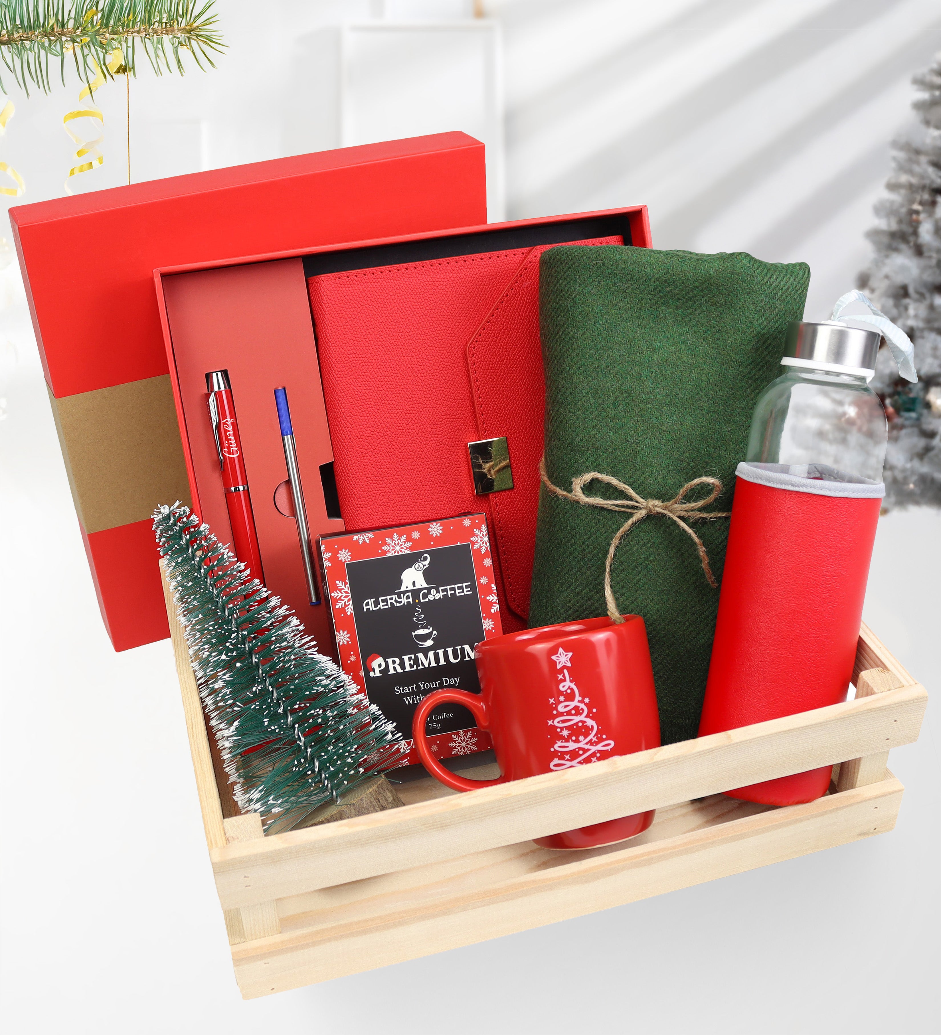 Ahşap Kasada Defter Kalem Seti & Kalın Şal & Su Matarası & Kupa & Filtre Kahve & Mini Çam Ağacı Hediye Seti