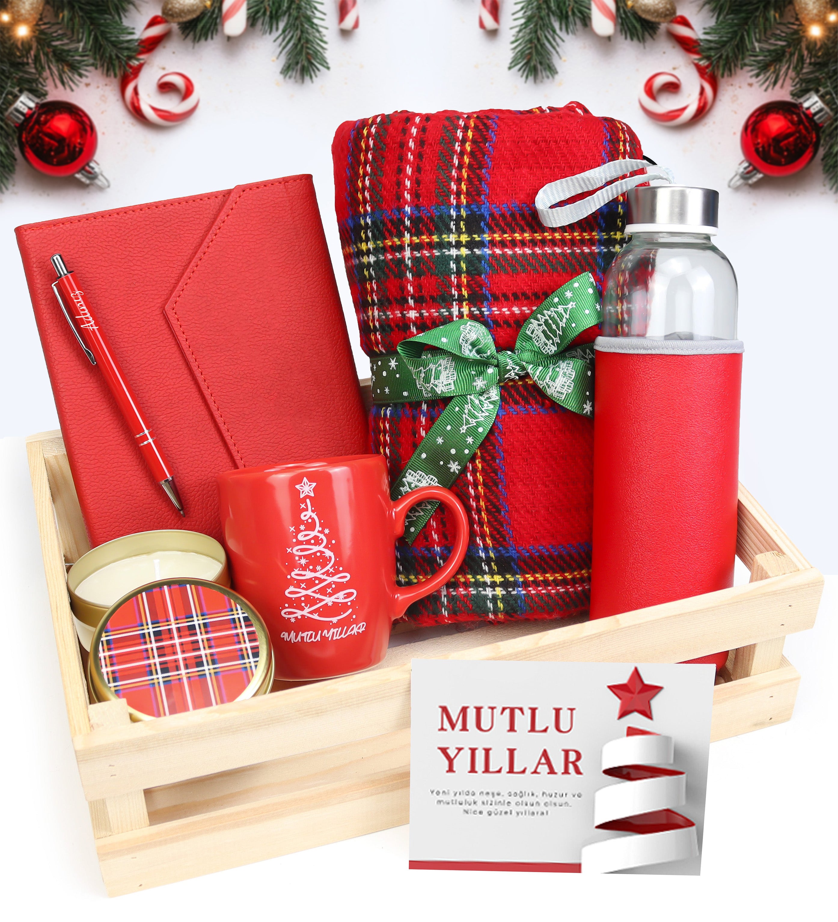 Set İçeriği : 1 Adet Ahşap Kasalı Kişiye Özel Gümüş Renk Detaylı Kırmızı Tükenmez Kalem & 1 Adet Zarf Model Defter & 1 Adet Ekose Desenli Metal Kutulu Mum & 1 Adet Mutlu Yıllar Kupa & 1 Adet Kalın Şal & 1 Adet Deri Kılıflı Su Matarası