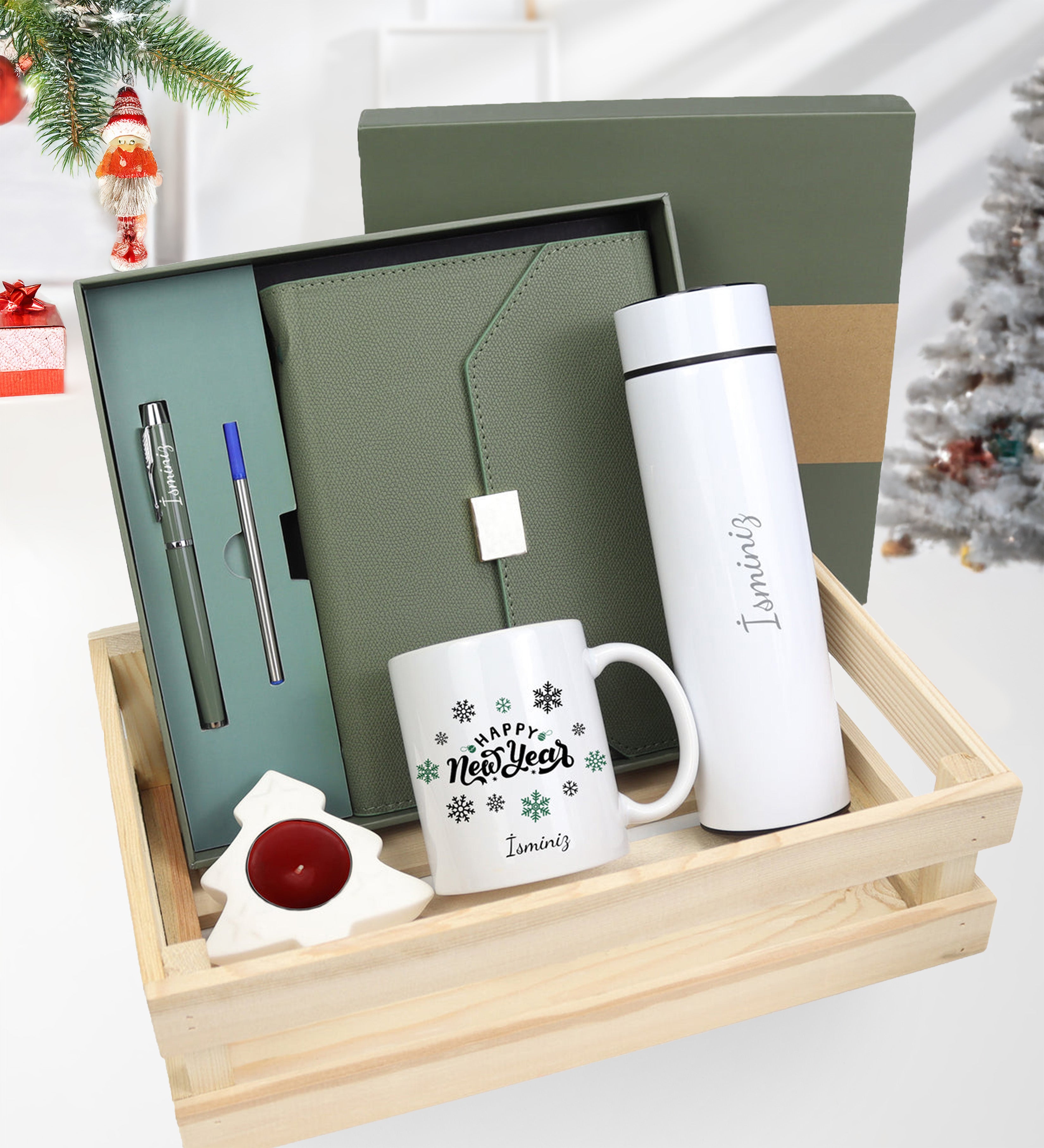Set içeriği: 1 Adet Kişiye Özel Kutulu Defter Kalem Seti & 1 Adet 500 ML Dereceli Termos & 1 Adet Baskılı Kupa & 1 Adet Alçı Çam Ağacı Mum
