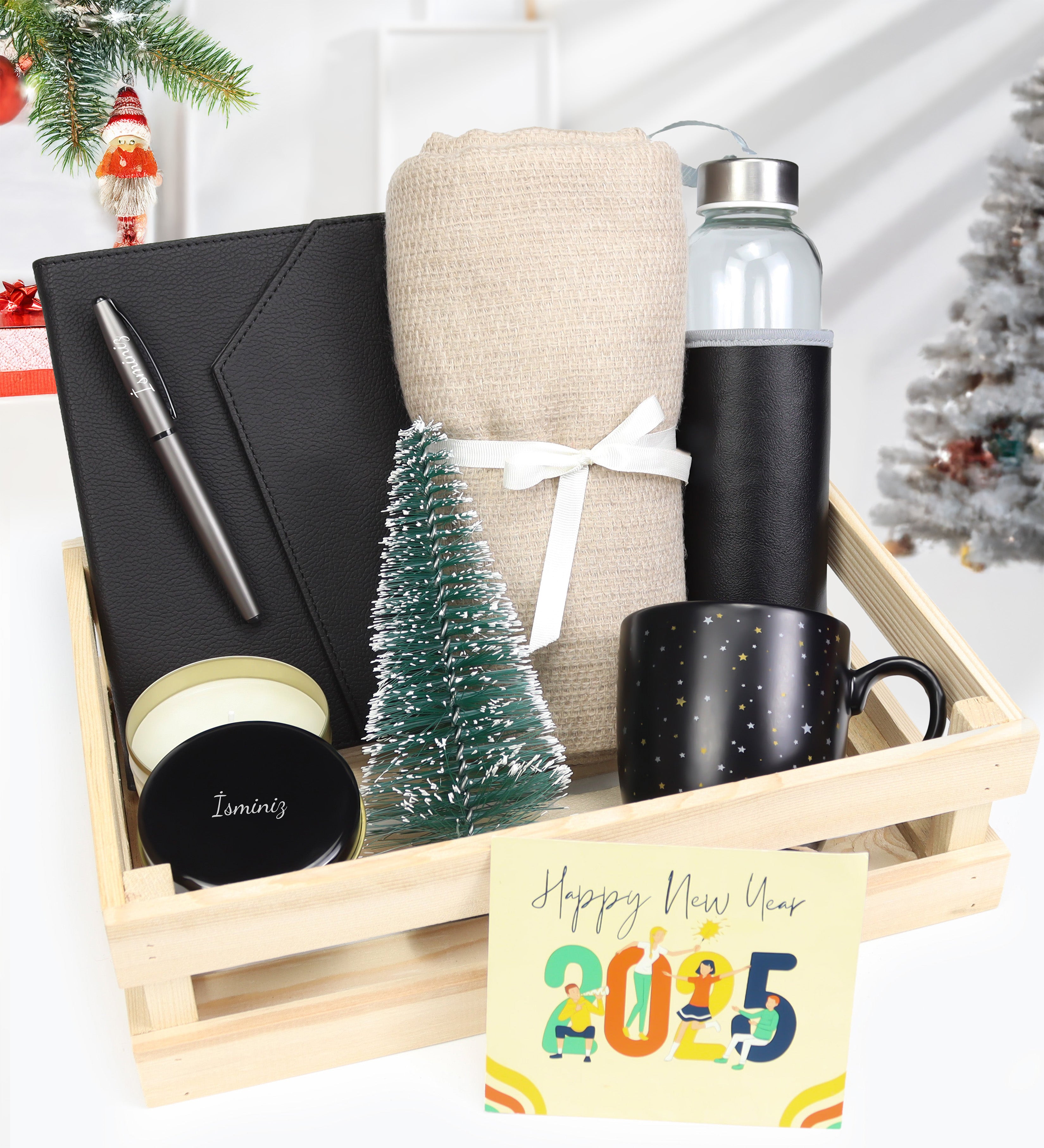Ahşap Kasada Roller Kalem & Defter & Kutulu Mum & Kalın Şal & Su Matarası & Yıldız Kupa & Mini Çam Ağacı Hediye Seti