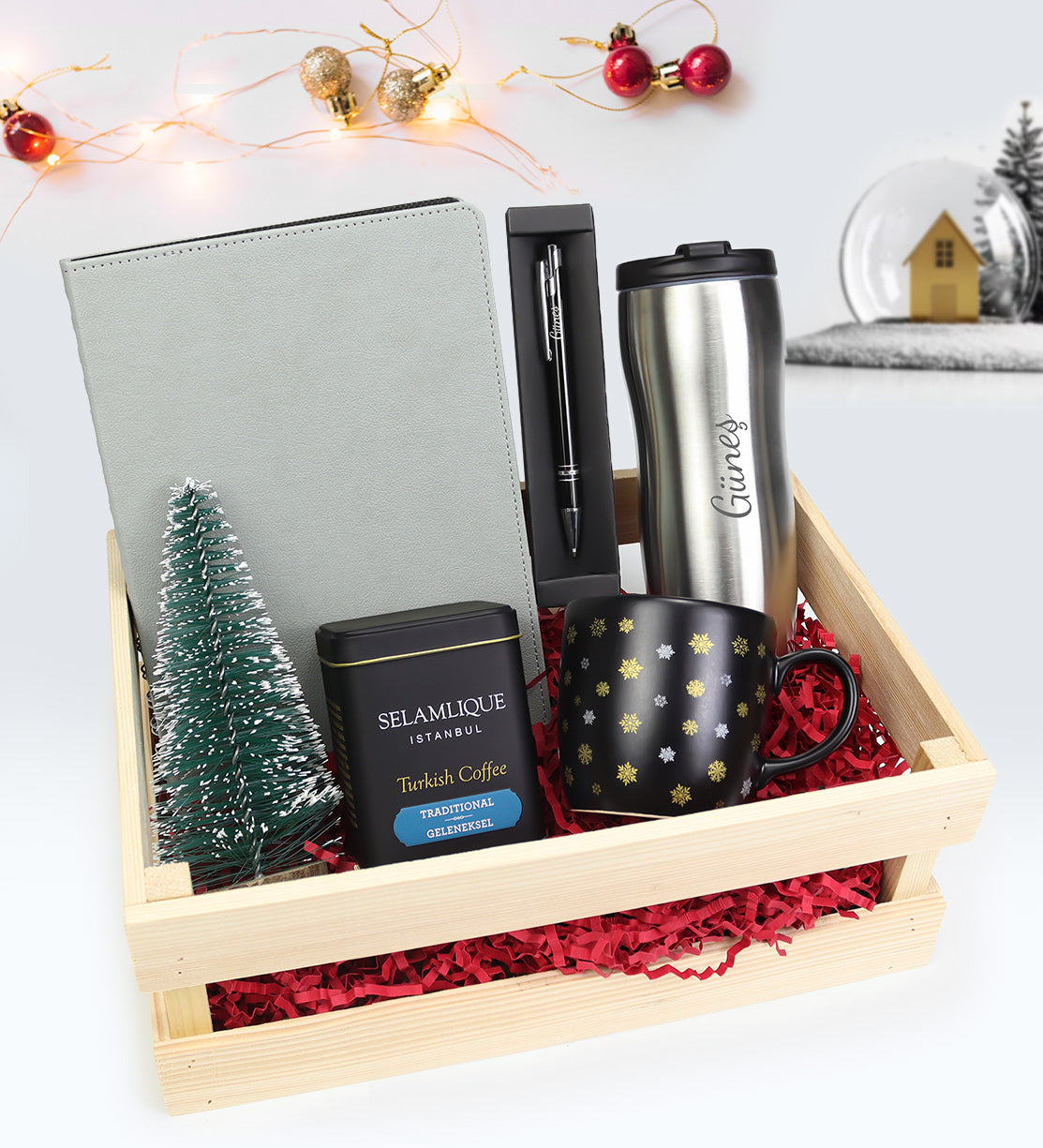Ahşap Kasalı Kişiye Özel Termos & Yeni Yıl Tarihli Ajanda & Siyah Tükenmez Kalem & Selamlıque Türk Kahvesi & Siyah Mat Kupa & Mini Çam Ağacı Hediye Seti