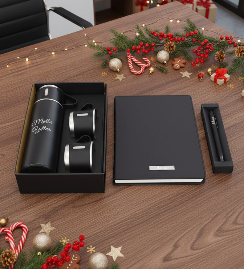 Kişiye Özel Bardaklı Termos & Spiralli 2025 Yeni Yıl Tarihli Ajanda & Mat Roller Kalem
