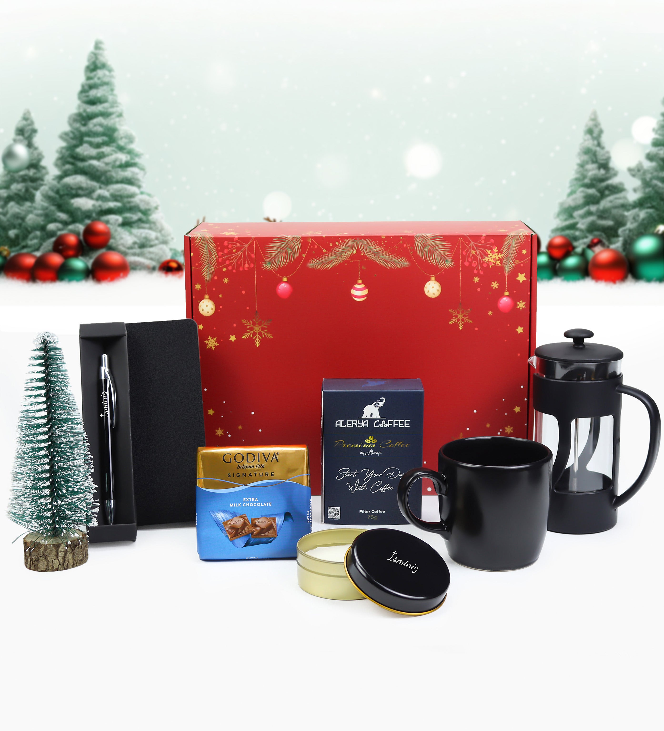 Kalem & Not Defteri & Çikolata & Kahve & Mum & Kupa & French Press & Çam Ağacı Hediye Kutusu