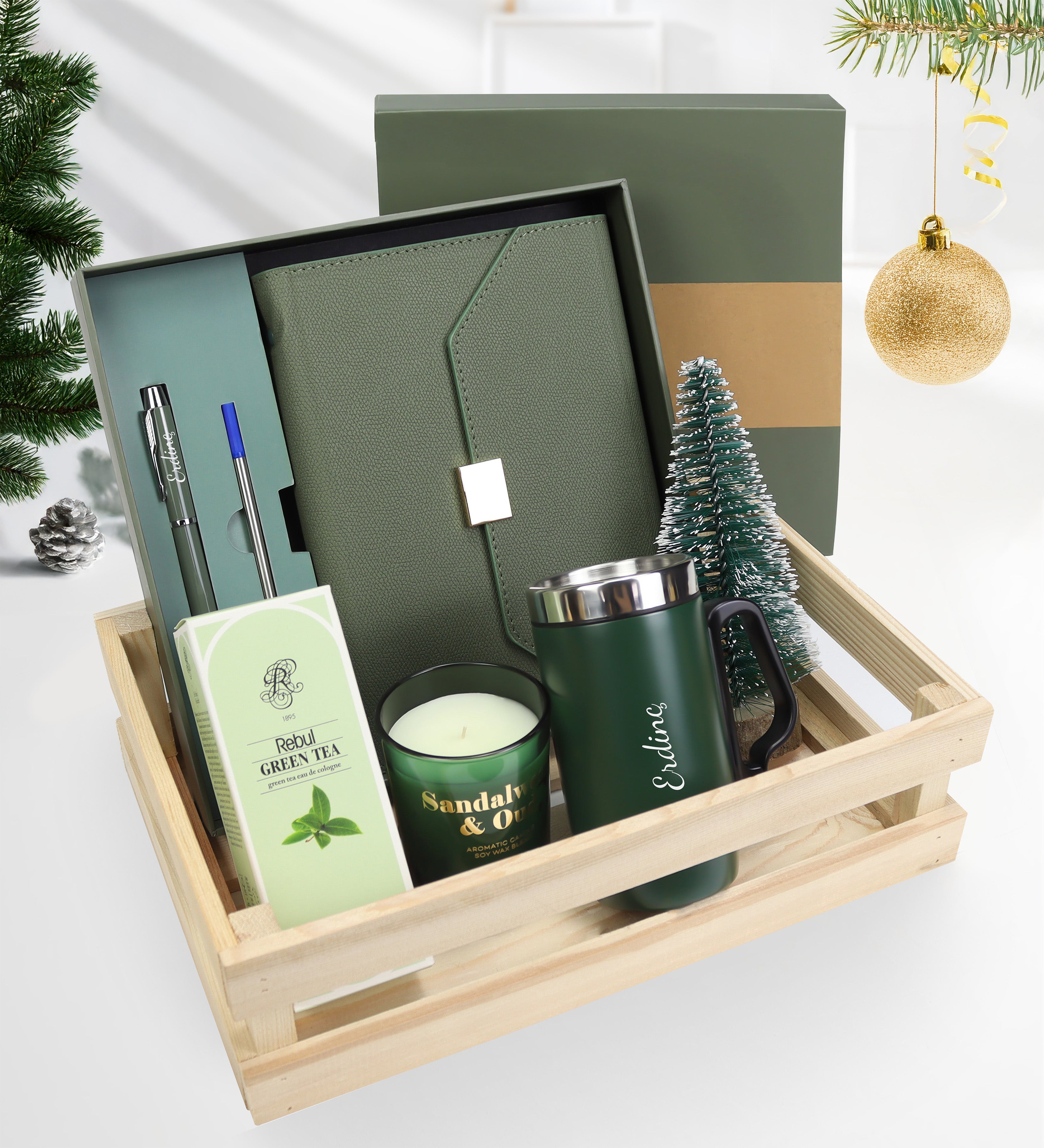 Kişiye Özel Kutulu Defter Kalem Seti & Kulplu Termos & Bardak Mum & Kolonya & Mini Çam Ağacı Hediye Seti