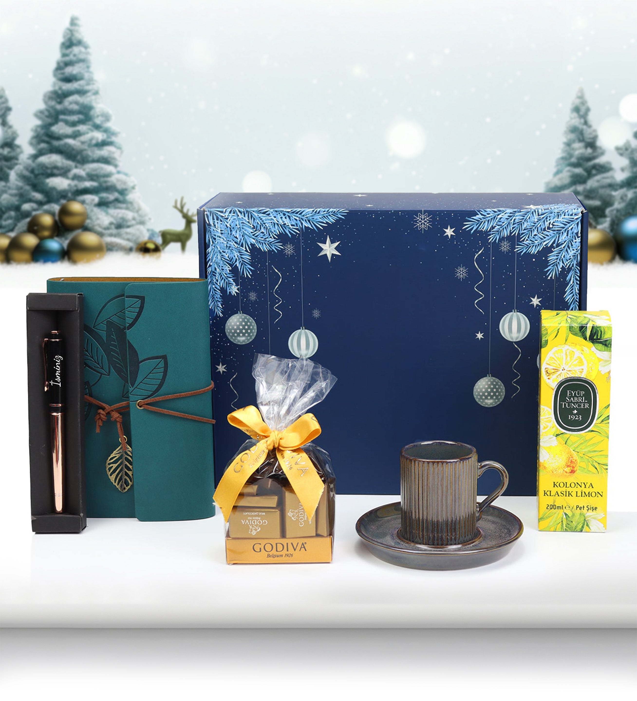 Set içeriği: 1 Adet Metalik Roller Kalem & 1 Adet Deri Kapaklı Vintage Anı-Seyahat Defteri & 1 Adet Lacivert Çizgili Porselen Kupa & 1 Adet Godiva Napoliten Çikolata & 1 Adet Eyüp Sabri Tuncer Klasik Limon Kolonyası
