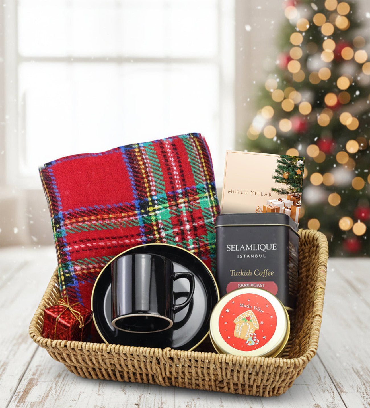 Set İçeriği: 1 Adet Hasır Sepet & 1 Adet Kalın Şal & 1 Adet Metal Kutulu Mum & 1 Adet Gold Detaylı Fincan & 1 Adet Selamlıque Türk Kahvesi