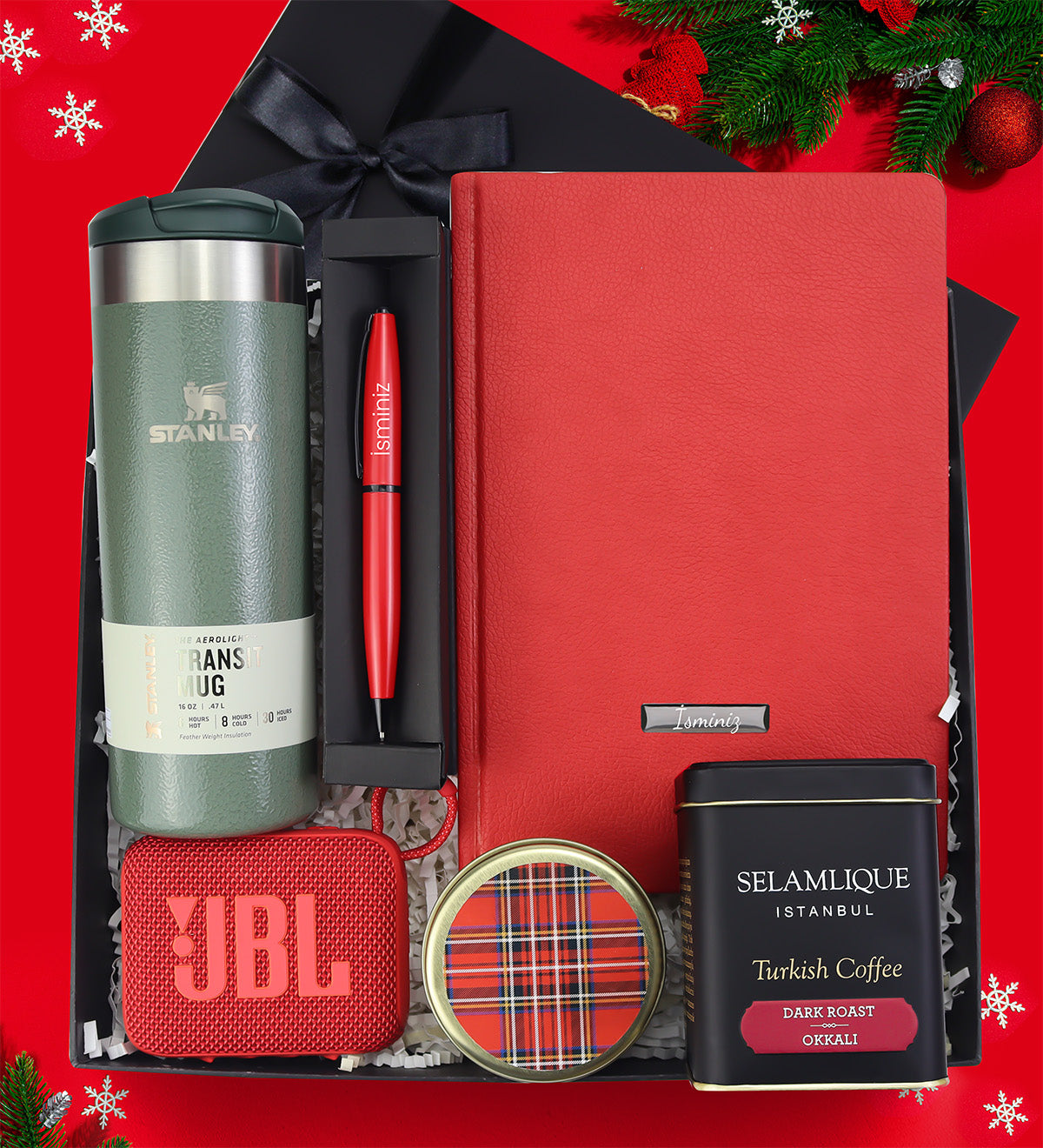 Set İçeriği: 1 Adet Metal Kutulu Mum & 1 Adet Yeni Yıl Tarihli Ajanda & 1 Adet JBL Hoparlör & 1 Adet Roller Kalem & 1 Adet Stanley Termos & 1 Adet Türk Kahvesi