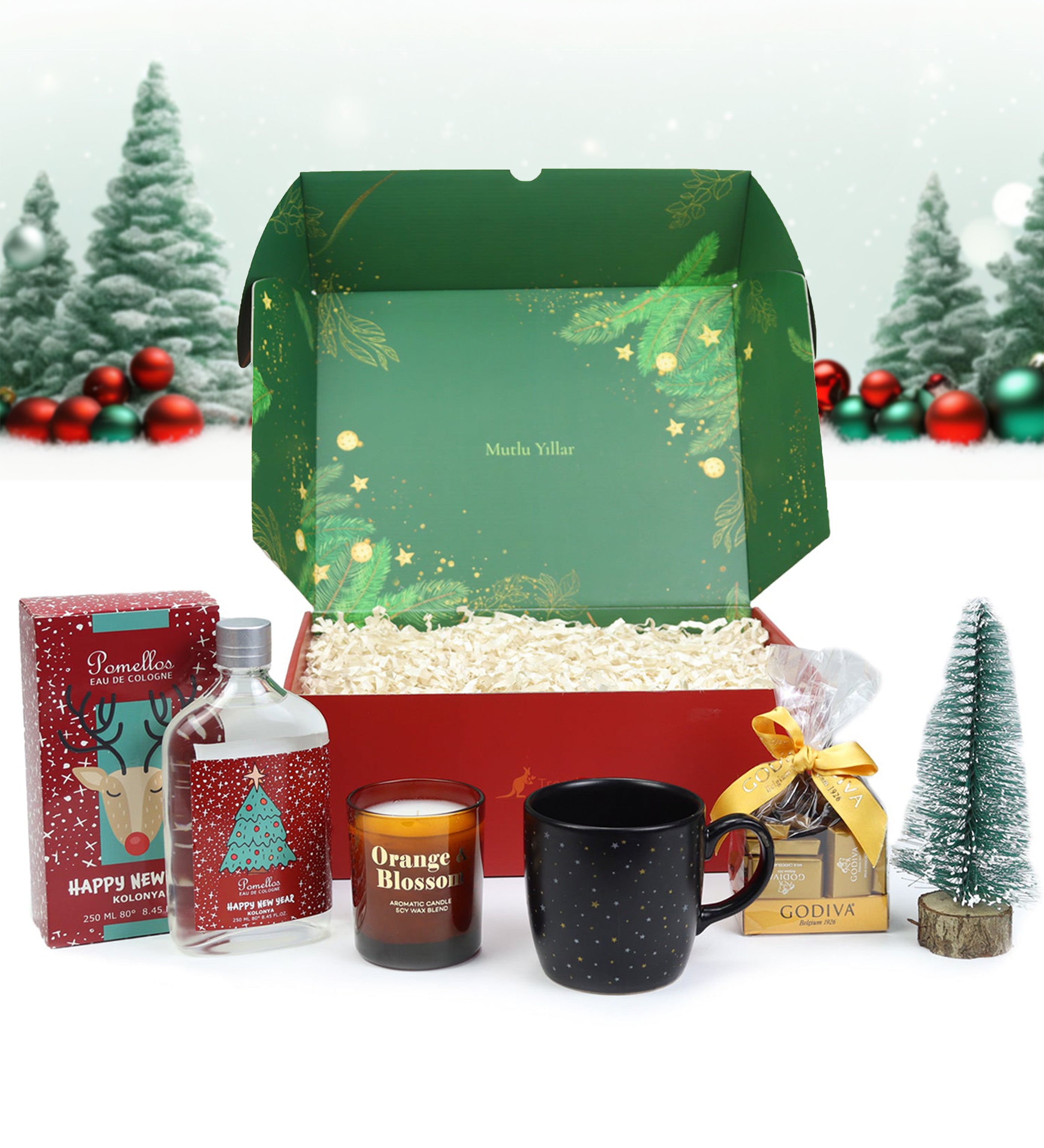 Set İçeriği; 1 Adet Yıldız Desenli Siyah Mat Kupa & 1 Adet Turuncu Bardak Mum & 1 Adet Godiva Napoliten Çikolata & 1 Adet Ahşap Zeminli Mini Çam Ağacı & 1 Adet Pomellos Kolonya