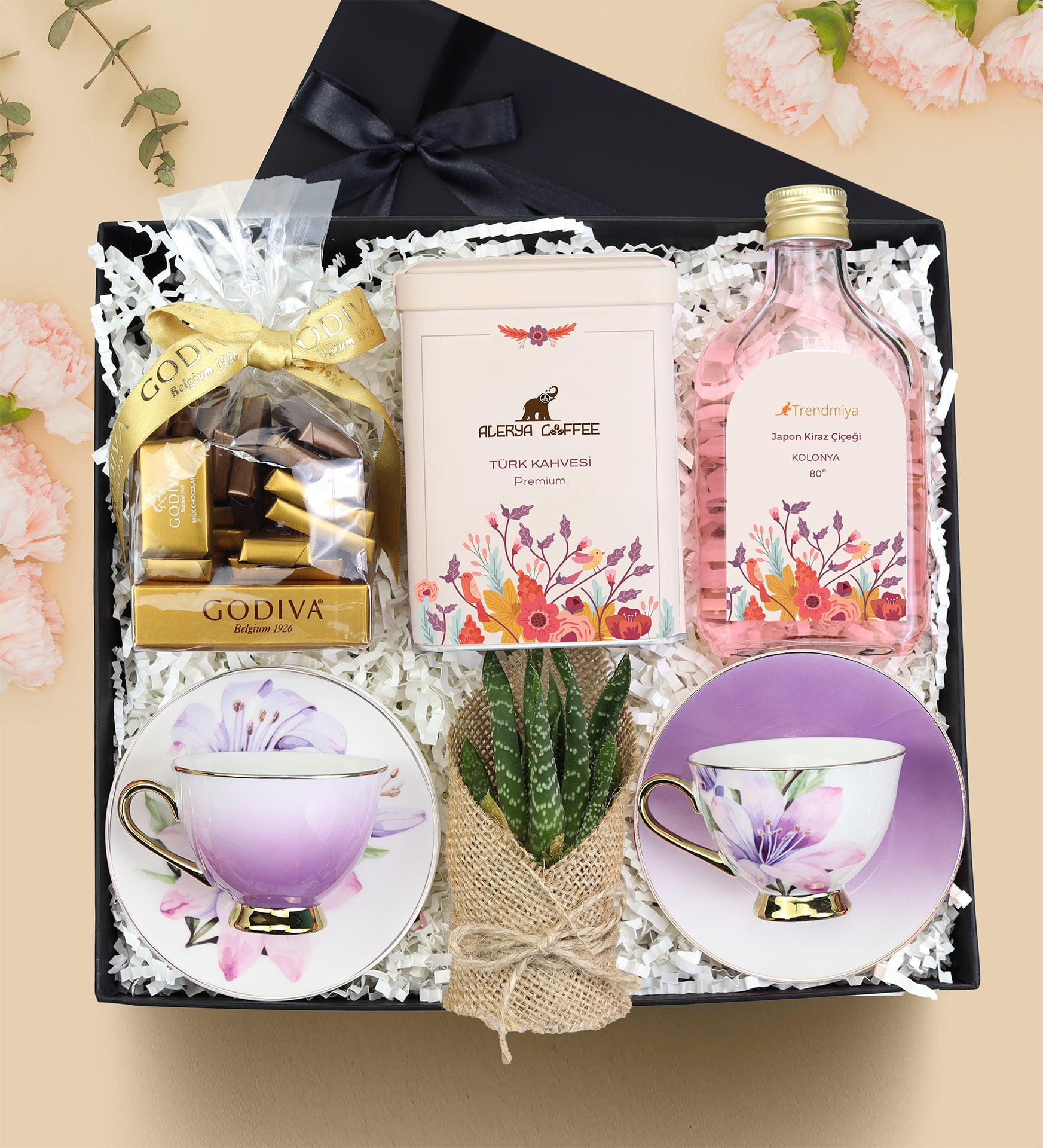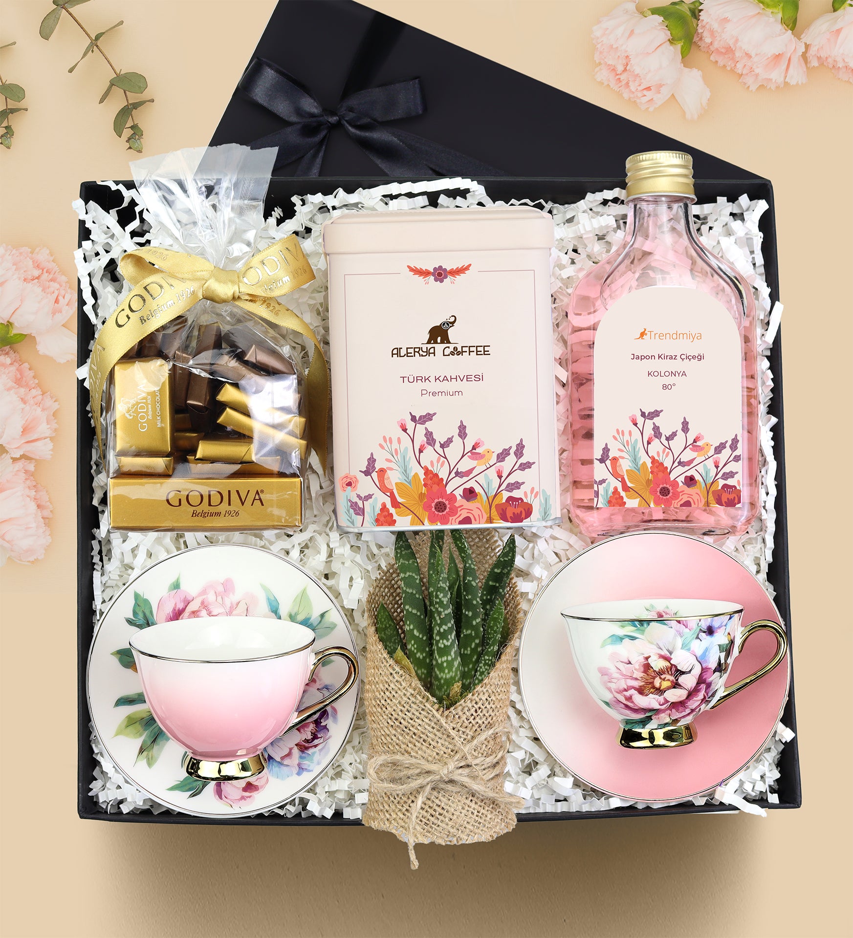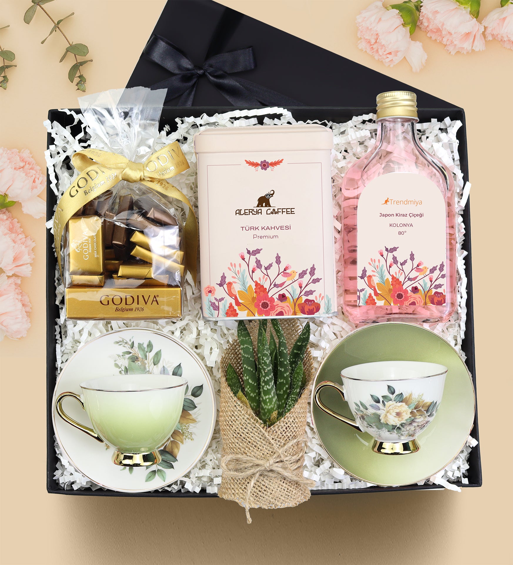 Set İçeriği: 2 Adet Kahve Fincanı & 1 Adet Alerya Türk Kahvesi & 1 Adet Godiva Napoliten Çikolata & 1 Adet Sukulent & 1 Adet Kolonya