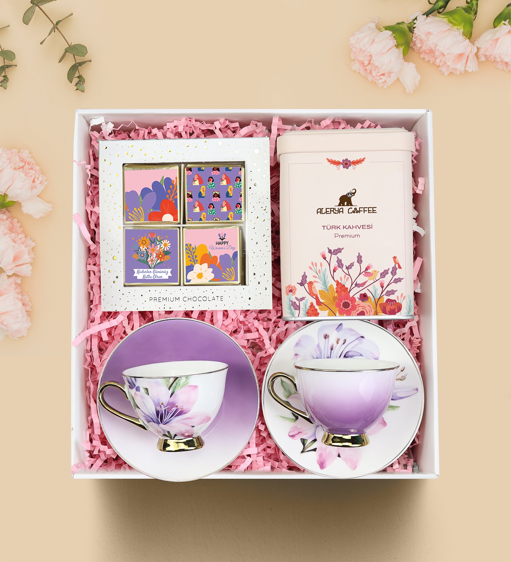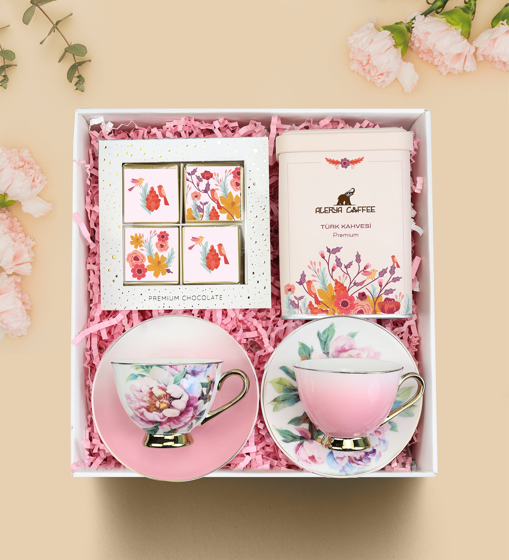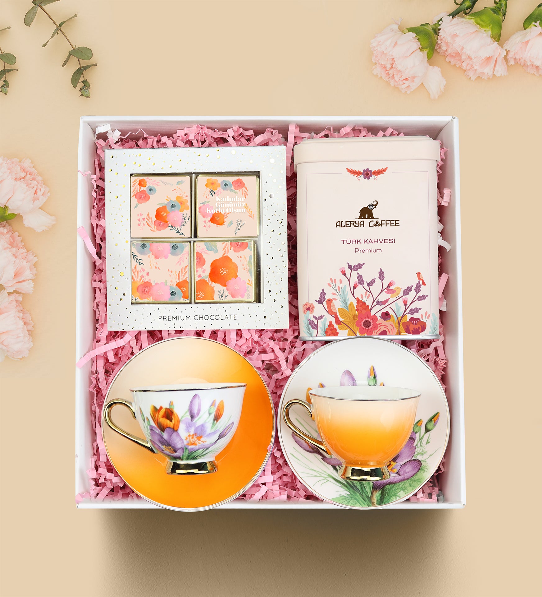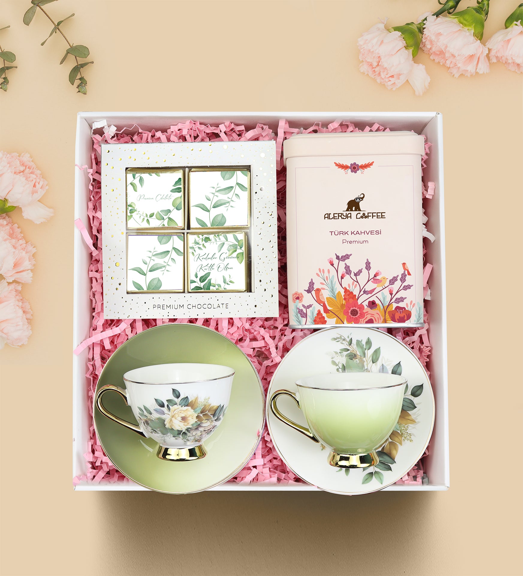 Set İçeriği: 2 Adet Kahve Fincanı & 1 Adet Premium Madlen Çikolata & 1 Adet Alerya Türk Kahvesi