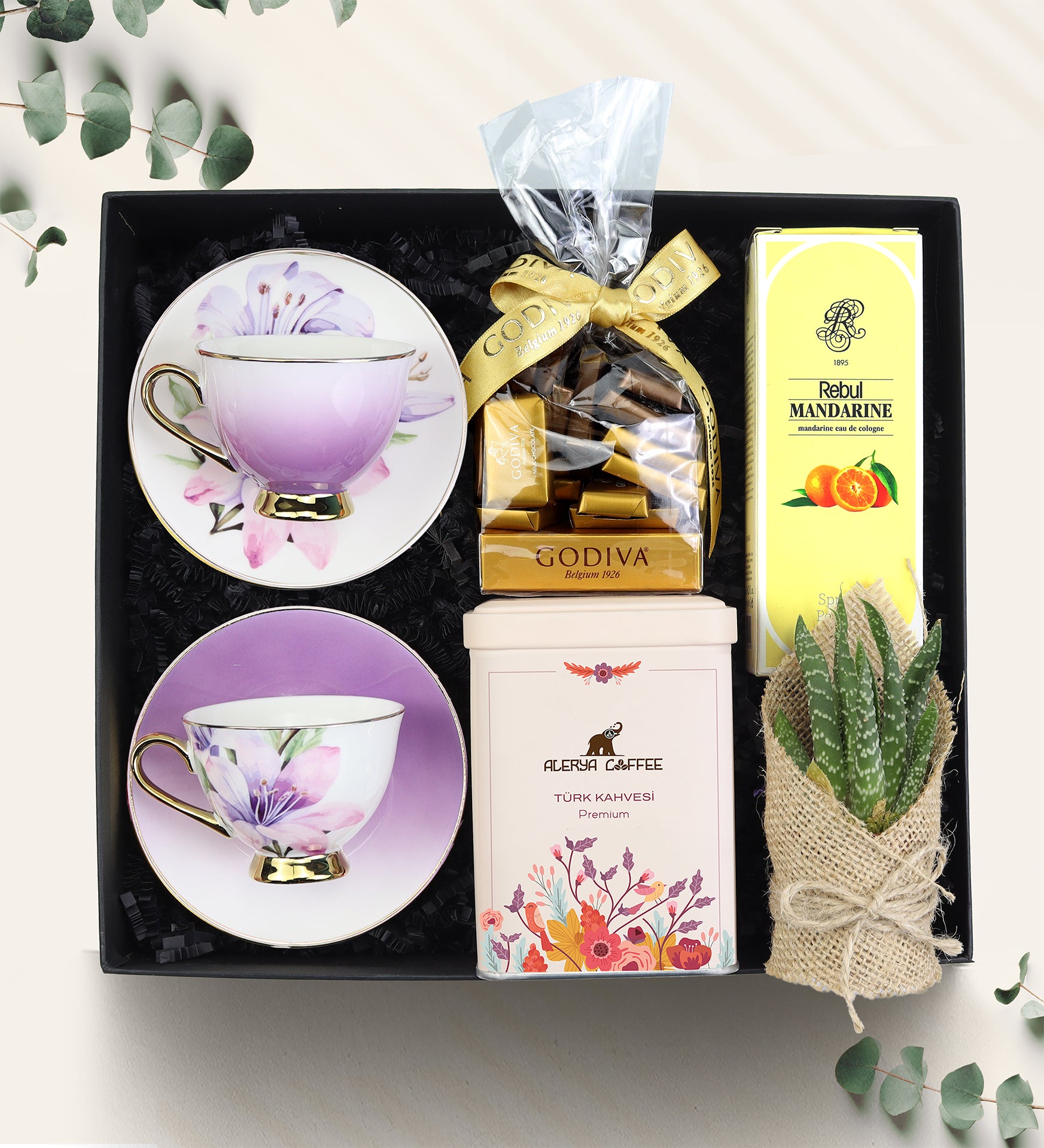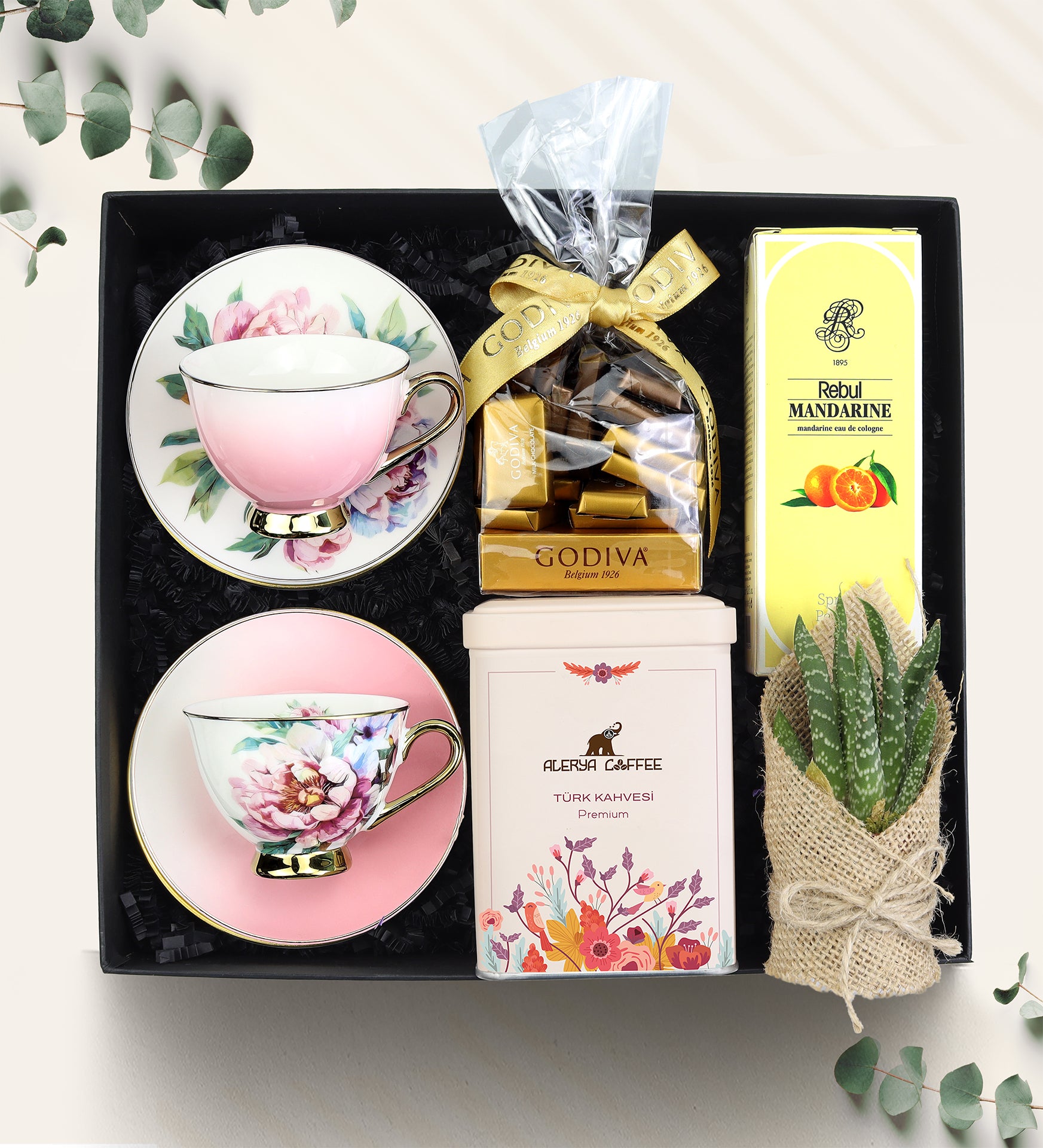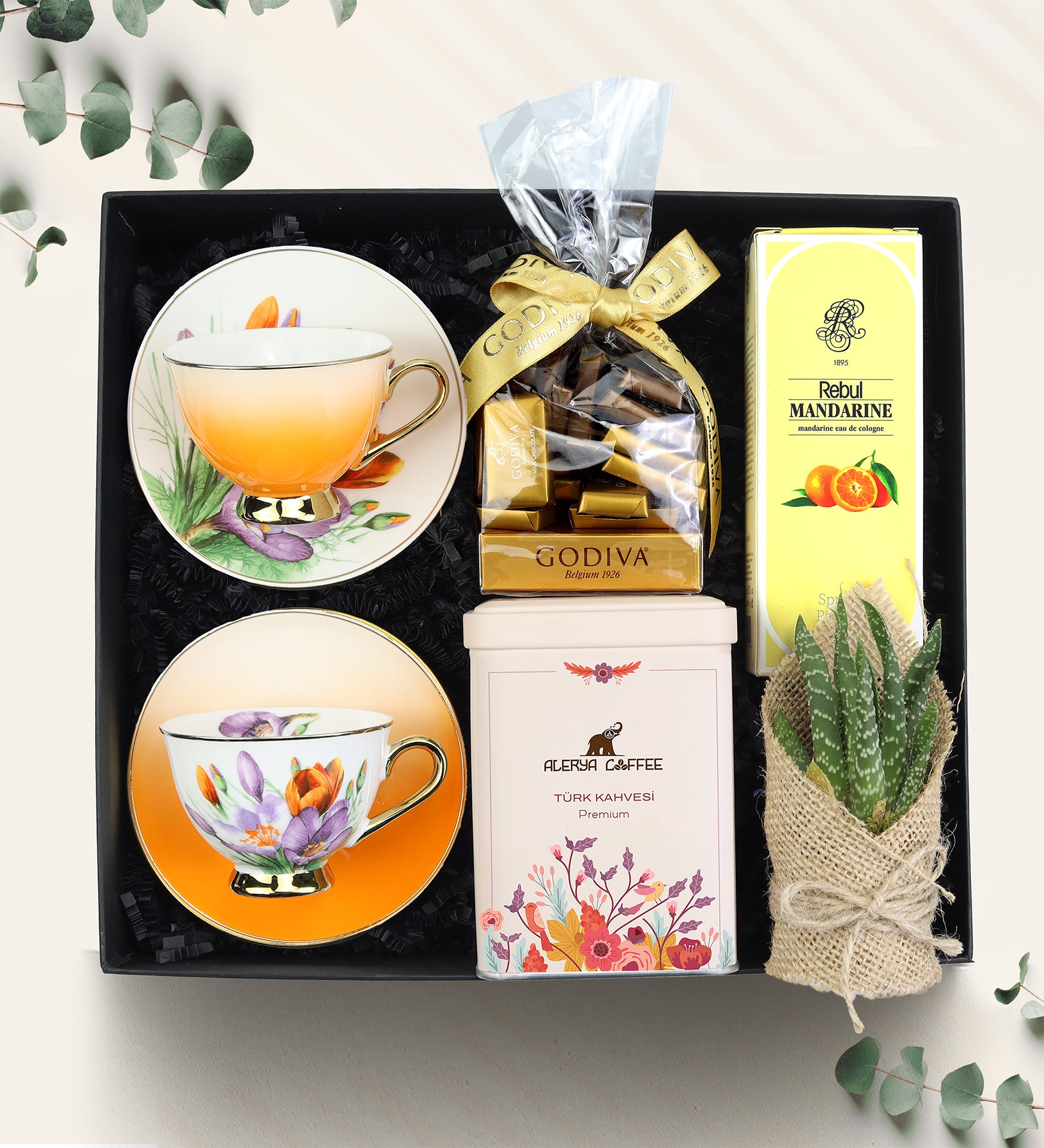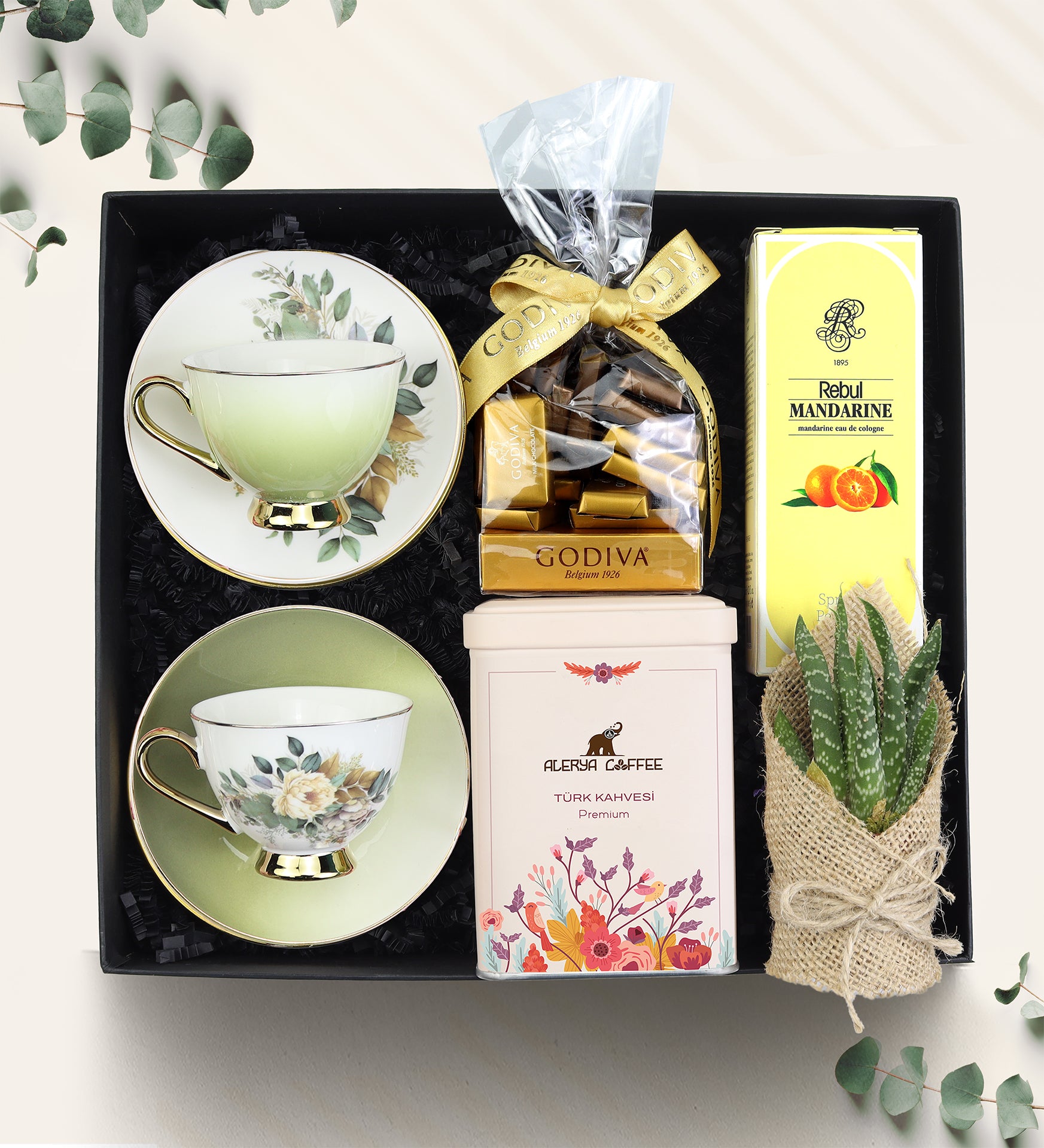 Set İçeriği: 2 Adet Kahve Fincanı & 1 Adet Alerya Türk Kahvesi & 1 Adet Godiva Napoliten Çikolata & 1 Adet Sukulent & 1 Adet Kolonya
